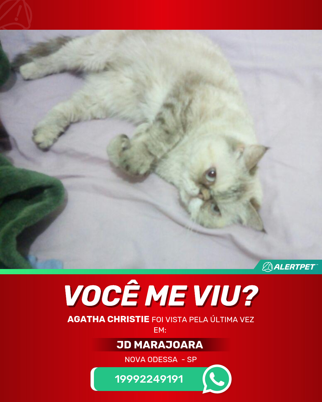 #AlertPet #Procurase #GatoDesaparecido #NovaOdessa #ProcuramosAgathaChristie