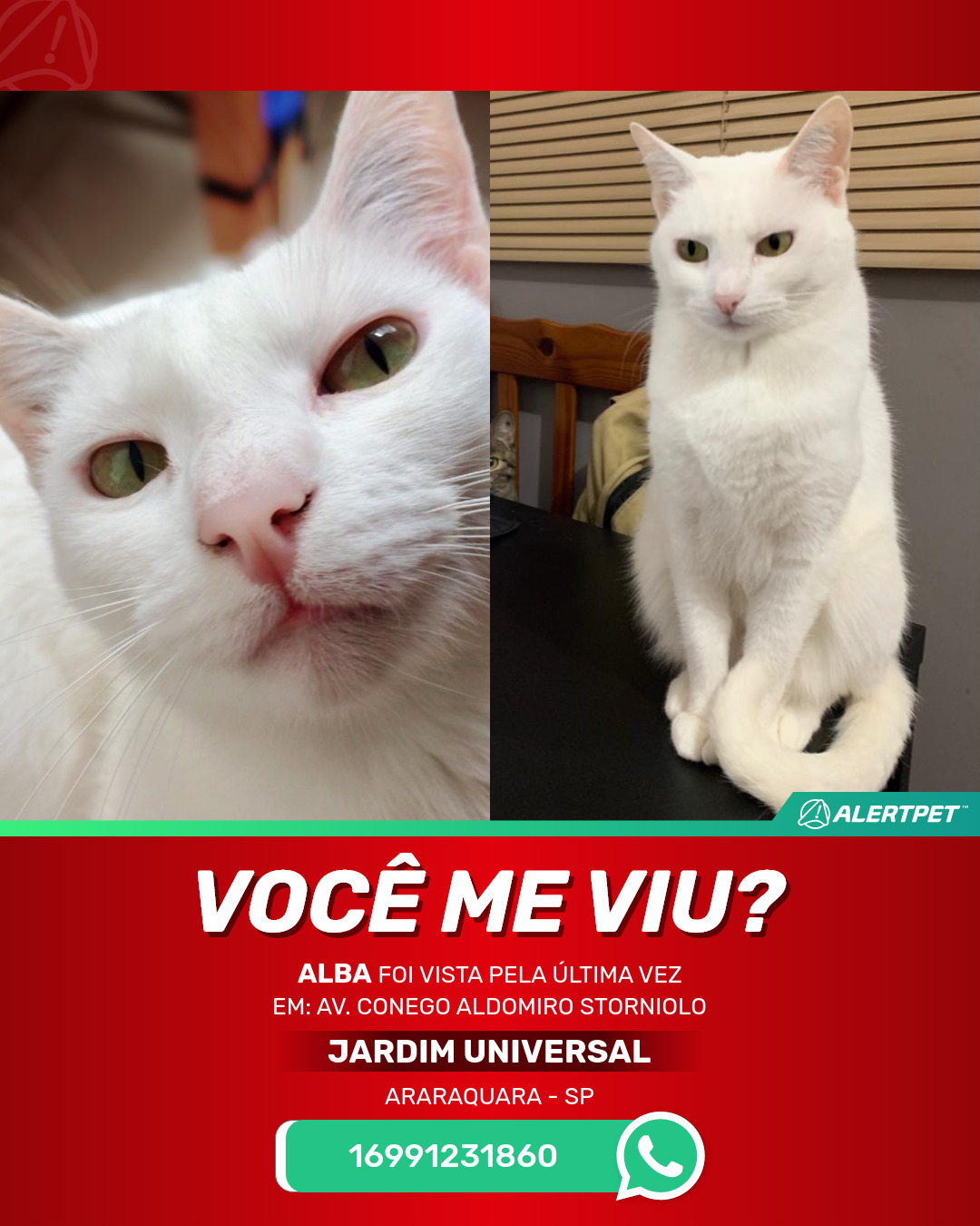 Alba é uma gata muito carinhosa, porém tem medo de estranhos. Tem o pêlo todo branco e marcas azuis dentro das orelhas, simbolizando que é castrada e microchipada. O chip fica perto do pescoço, interno, e pode ser escaneado nas clínicas veterinárias.
