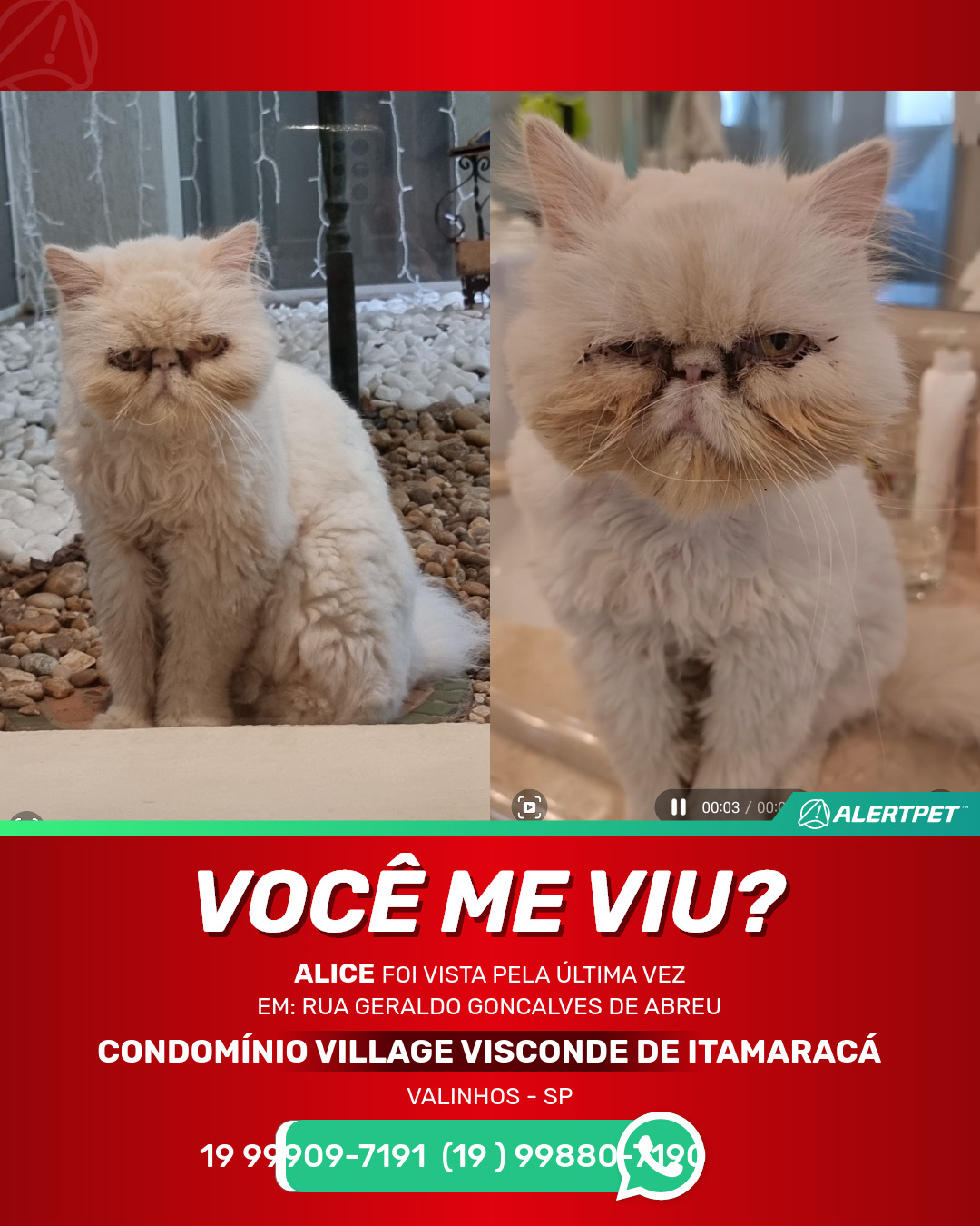 Alice é uma gata adulta ( persa misturada ) branca ( mas está suja de terra) , tem olhos AMARELOS. , 7 anos, castrada . Tem a carinha bem amassadinha… Ela tem um problema facial …que passa a impressão que tem um lado meio tortinho. Tb tem dificuldade para comer devido ao problema. Então ela está sempre com a carinha, o queixo sujinho de patê que come. Costuma dormir no jardim …na terra , e acaba ficando sempre sujinha… Os olhinhos quando não limpamos todos os dias ficam bem escuros com ramelinhas. Ela nunca saia de casa… no máximo na calçada. Então não conseguimos entender como sumiu de dentro do nosso quintal…se correu atrás de algum bichinho….ou se ela se assustou com algo…ou se levaram.