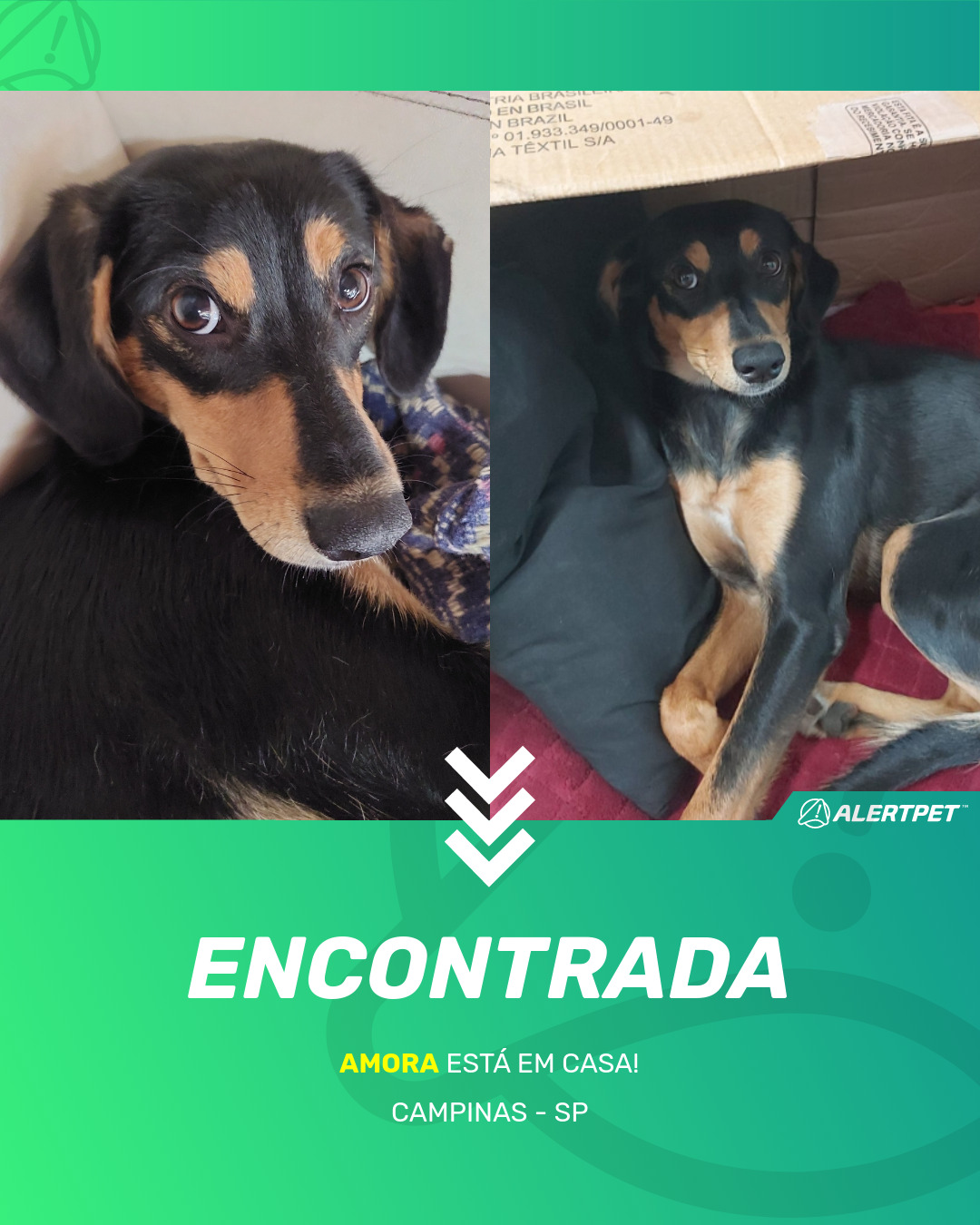 Depois de dois meses a cadelinha foi finalmente localizada graças a um anúncio da AlertPet