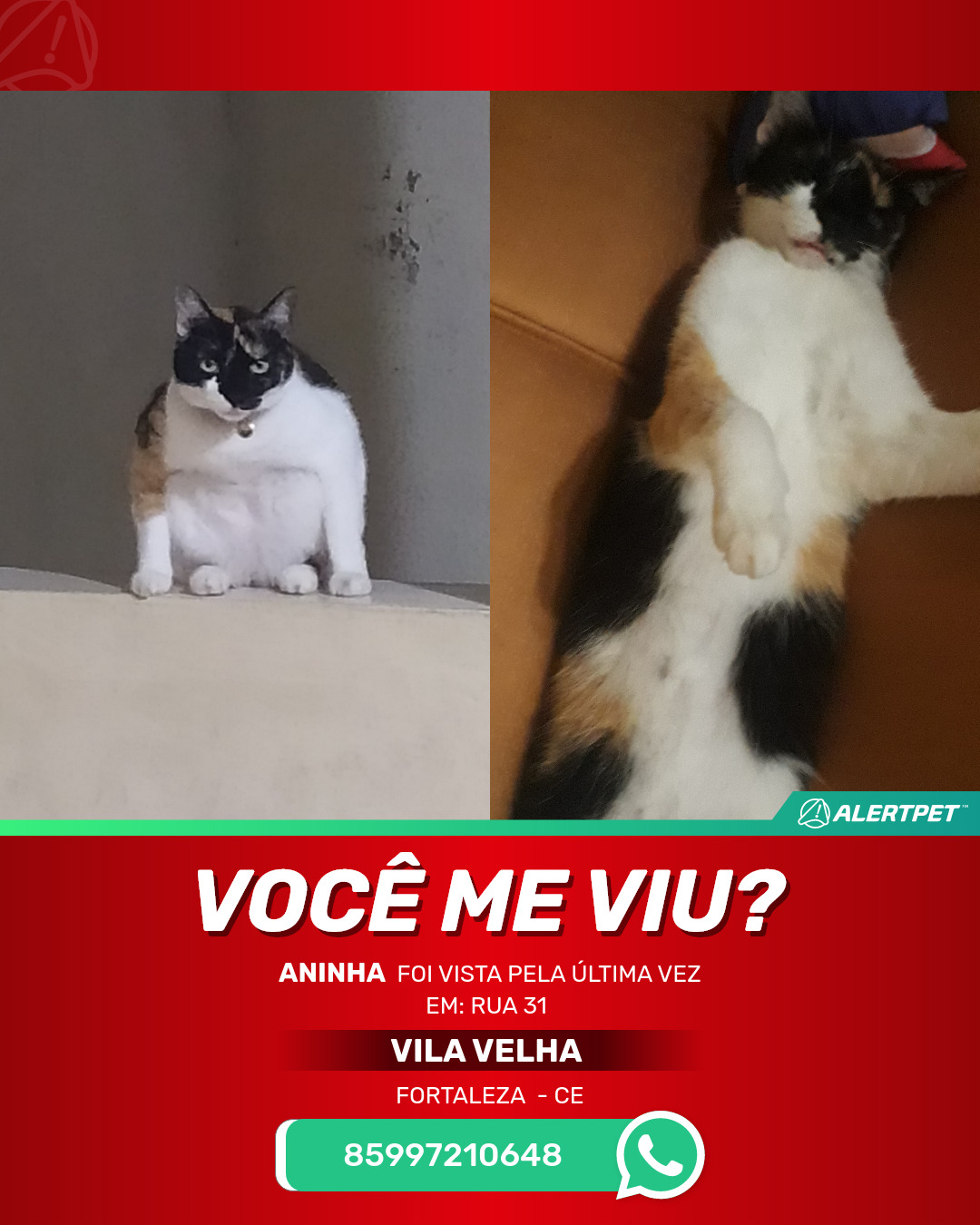Aninha é uma gata castrada, de 4 anos, com pelos nas cores preta, branca e laranja e olhos amarelos. No dia do desaparecimento, usava uma coleira com uma plaquinha de identificação, que contém seu nome e meu telefone. Caso alguém a tenha visto, favor entrar em contato.