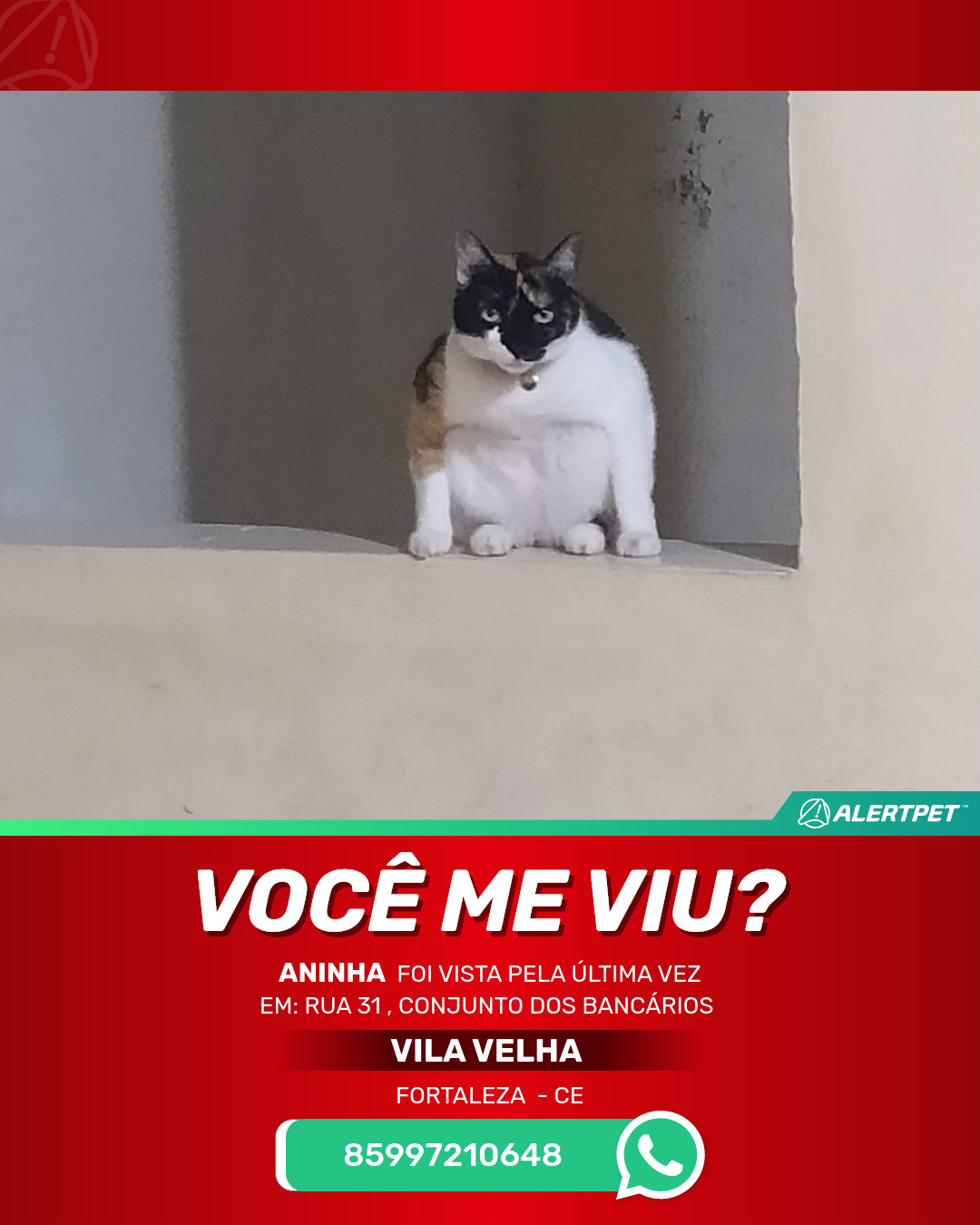 Olá, pessoal! Meu nome é Aline e estou à procura da minha gatinha Aninha. Ela tem 4 anos, é castrada, pelagem nas cores branc’a, pret’a e amarela e está usando uma coleira com uma plaquinha de identificação, na qual contém seu nome e meu telefone (WhatsApp). Ela saiu da minha casa no dia 12/10/22, à noite, no Conjunto dos Bancários (bairro Vila Velha, perto da Associação dos Moradores do Conjunto dos Bancários), sem que eu percebesse. Fui avisada pela minha vizinha, saí pra procurá-la, porém, sem sucesso. Sendo assim, peço que me procuram caso a vejam em algum lugar. Obrigada!
