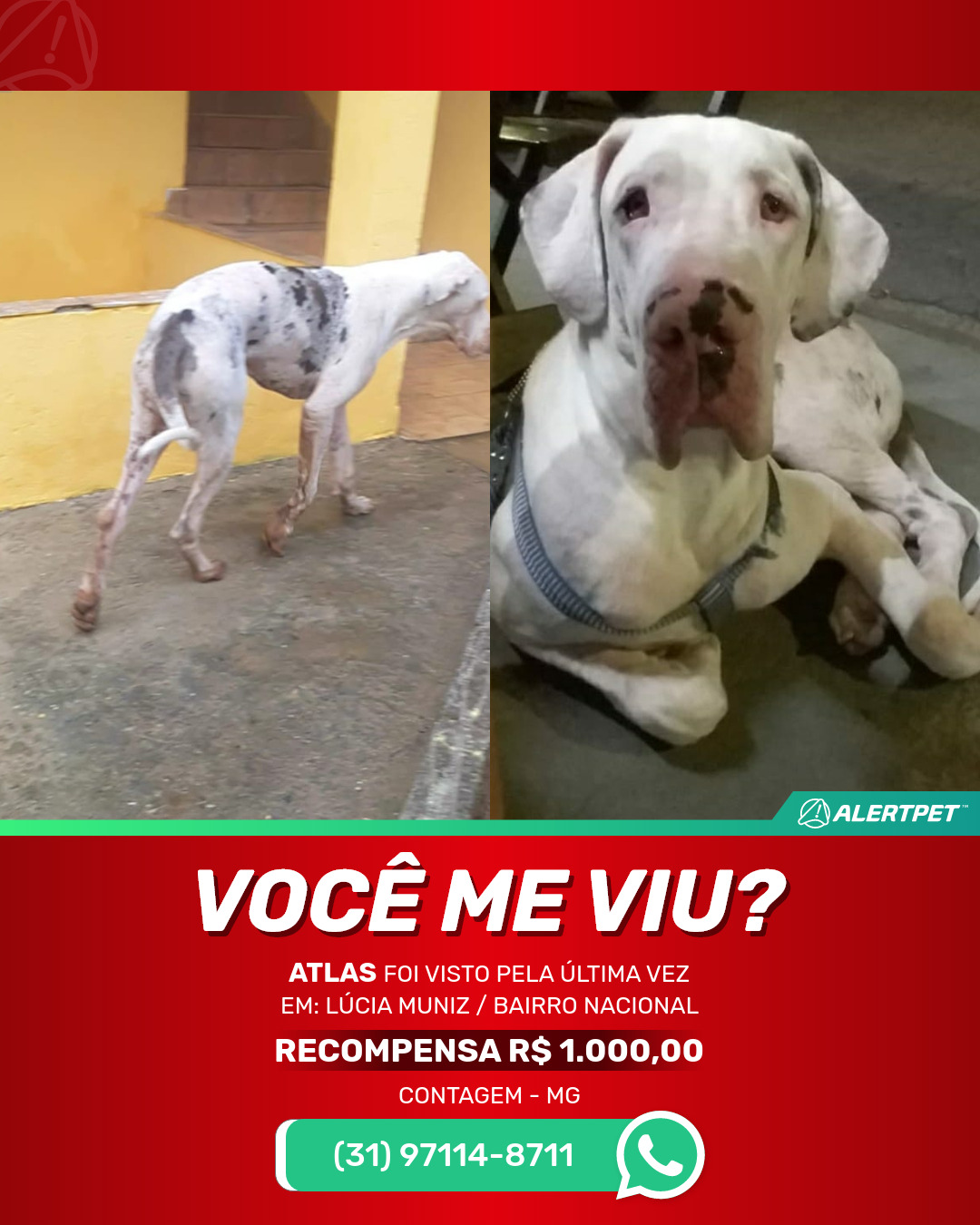 Cachorro Perdido Recompensa R$ 1.000,00 Contagem - Minas Gerais | ATLAS - 1 A