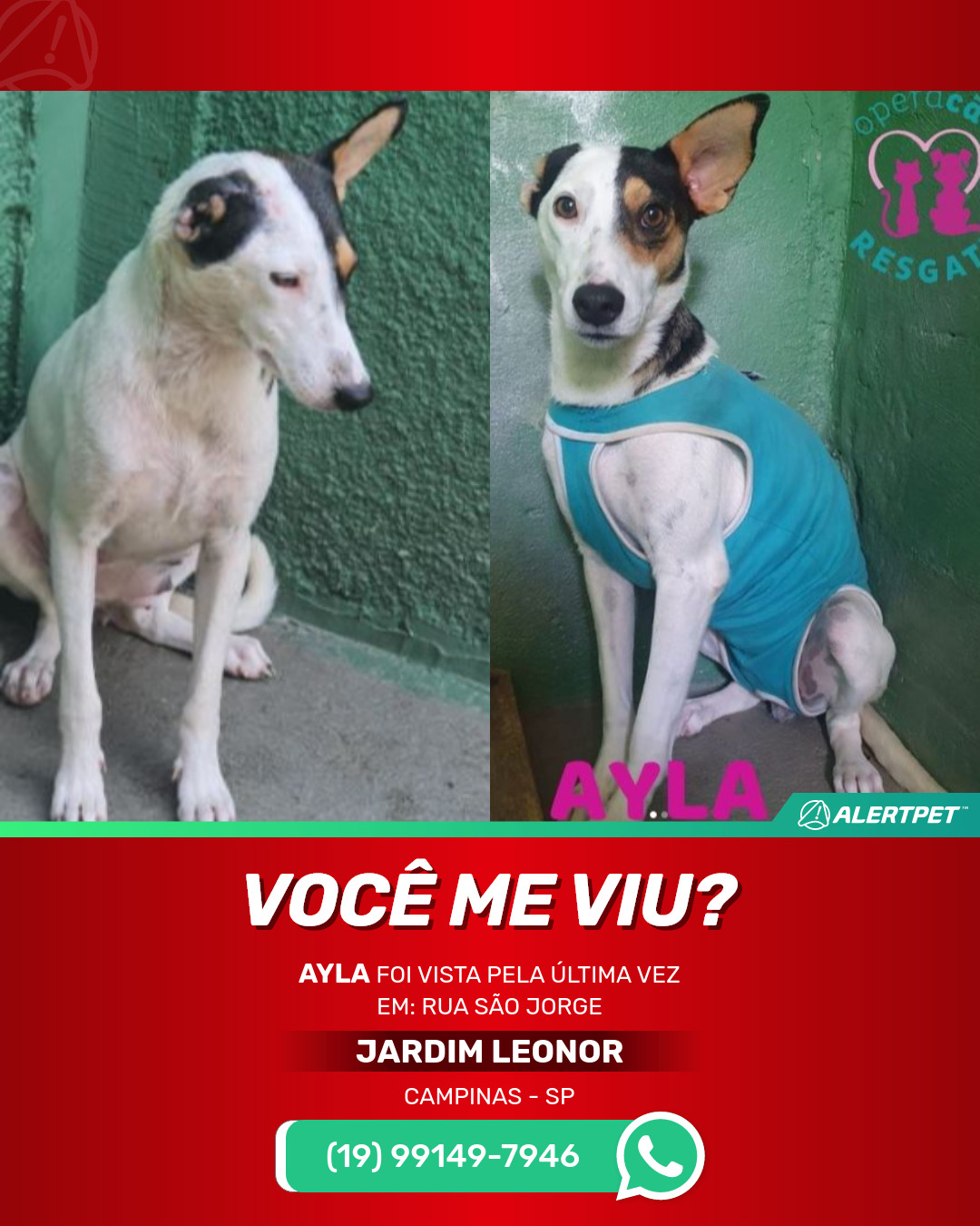 A Ayla é uma cachorrinha super medrosa! Se a ver não tente pega-la, por favor não a perca de vista e entre em contato conosco! Iremos até voce (19)98840-7723 – Elen ou (19)991497946 – Mariana.