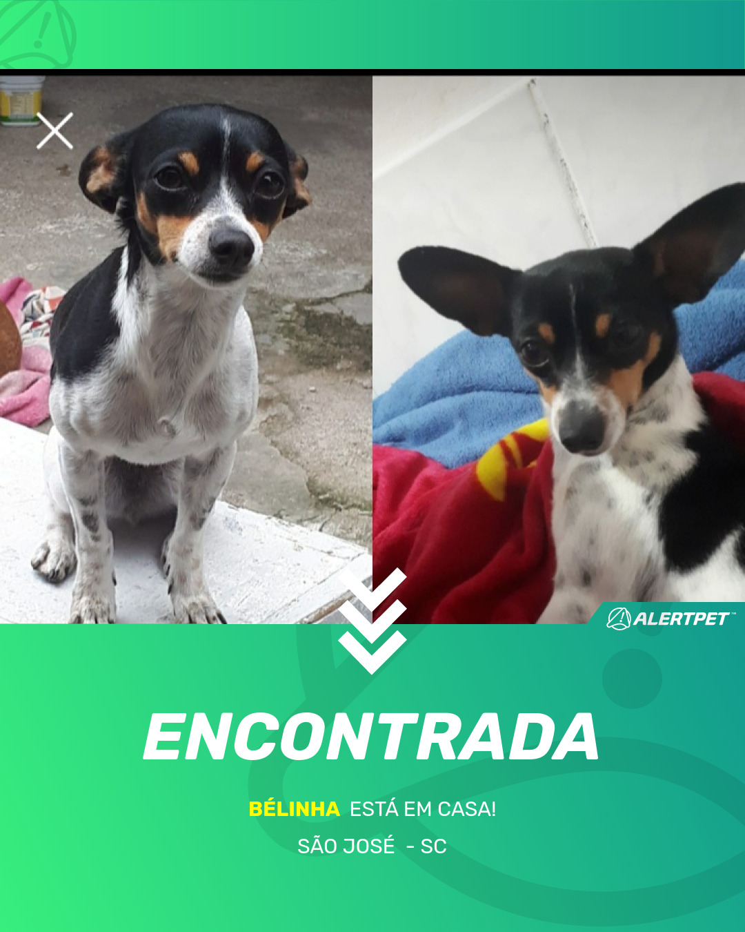 Depois de dois meses a cadelinha foi finalmente localizada graças a um anúncio da AlertPet