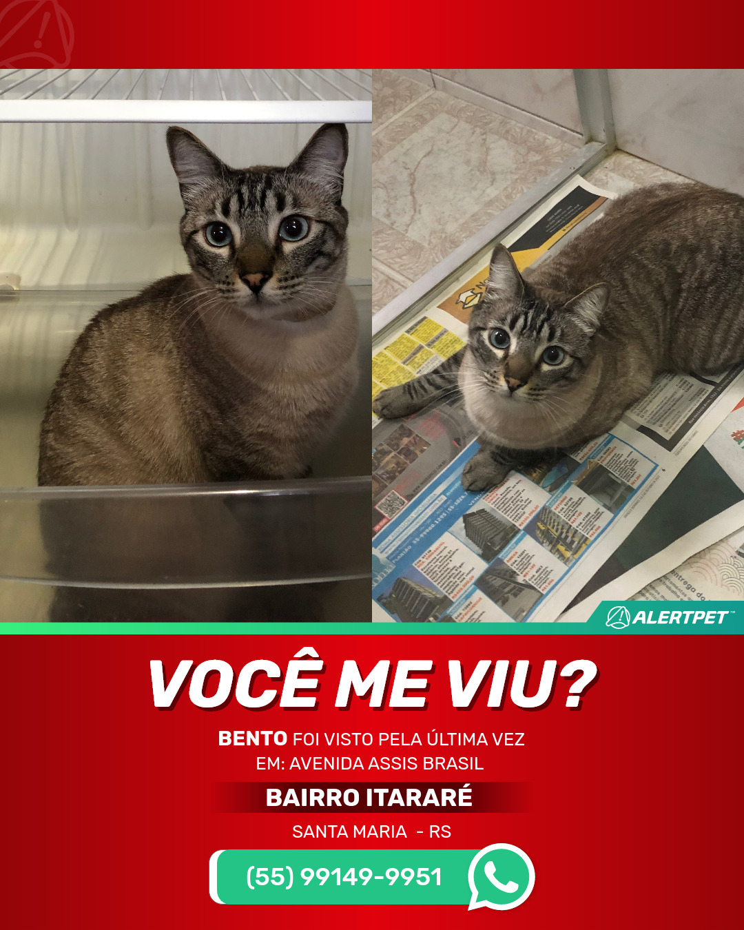 #AlertPet #Procurase #GatoDesaparecido #SantaMaria #ProcuramosBento