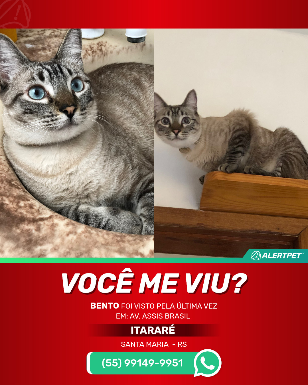 #AlertPet #Procurase #GatoDesaparecido #SantaMaria #ProcuramosBento