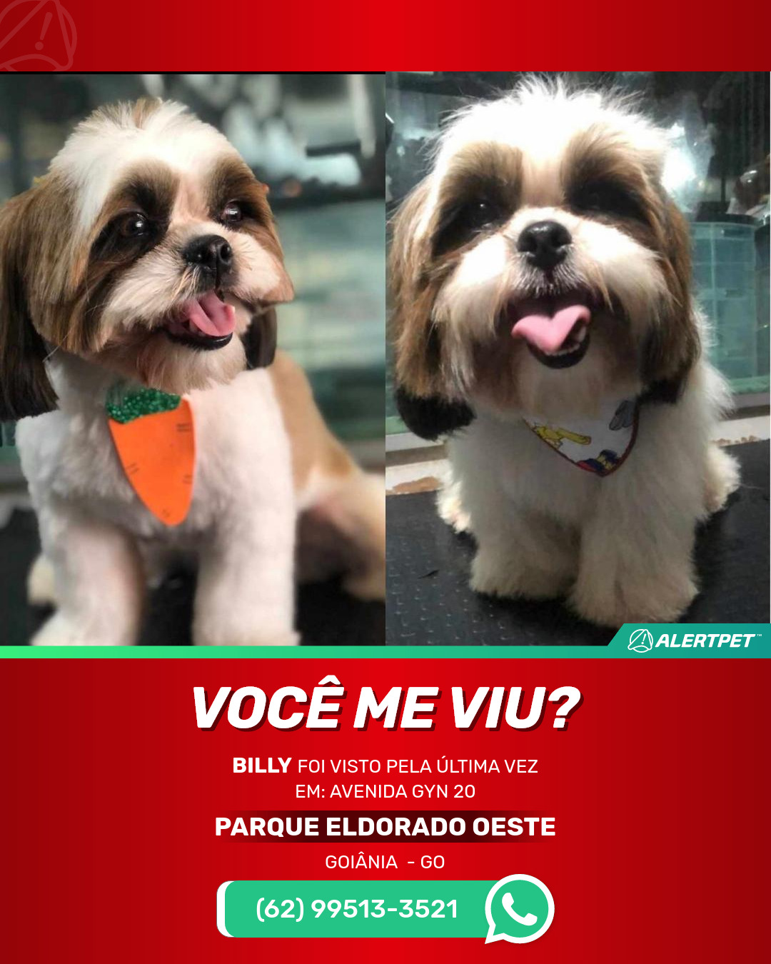 Cachorro com 2 anos de idade de porte pequeno que atende pelo nome de Billy, da raça shitszu e com pêlo médio, pelagem nas cores marrom com branco. A cabeça é marrom com a ponta das orelhas marrom escuro, carinha marrom com fucinho branco que se une a uma mancha branca na testa e se estende ao alto da cabeça , as quatro pernas são brancas, as são costas marrom com uma mancha branca na altura abaixo do pescoço que se junta ao branco das pernas da frente, calda branca com marrom. Super dócil, ele é castrado e quando sumiu ele estava com o pêlo tosado e usando uma gravata de cenoura.