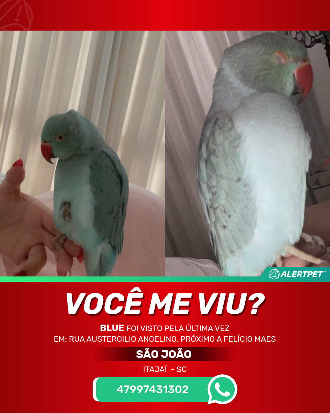 #AlertPet #Procurase #PassaroDesaparecido #Itajai #ProcuramosBlue