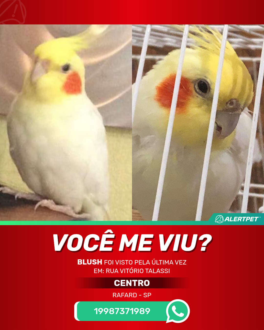 #AlertPet #Procurase #PassaroDesaparecido #Rafard #ProcuramosBlush