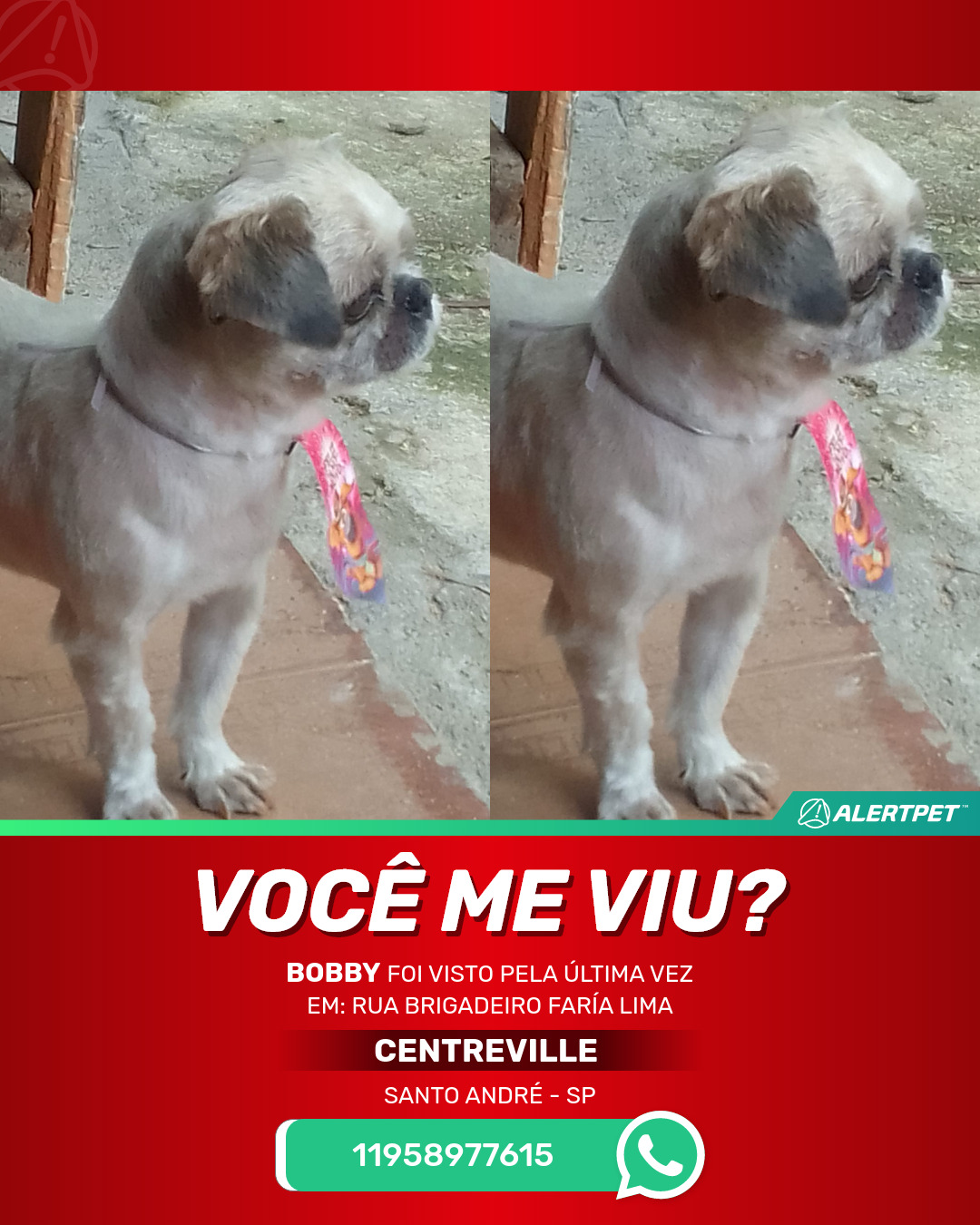 O bobby é um cachorro da raça shih tzu, desapareceu na manhã do dia 02/01/23 no centreville, Santo André SP. Ele é bem manso e medroso, estava tosado e com uma gravata rosa, escrito “feliz ano novo”.