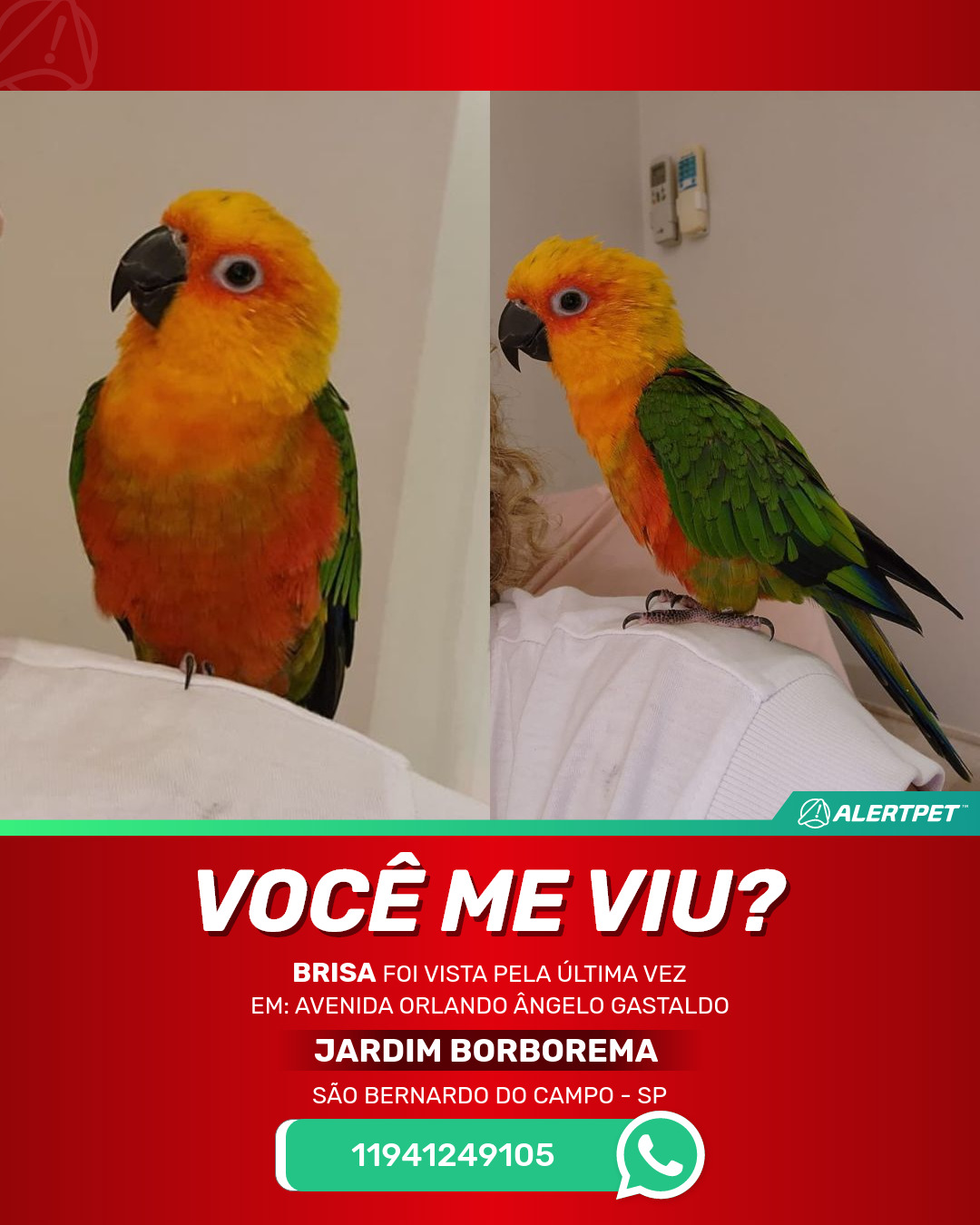 #AlertPet #Procurase #PassaroDesaparecido #SaoBernardoDoCampo #ProcuramosBrisa