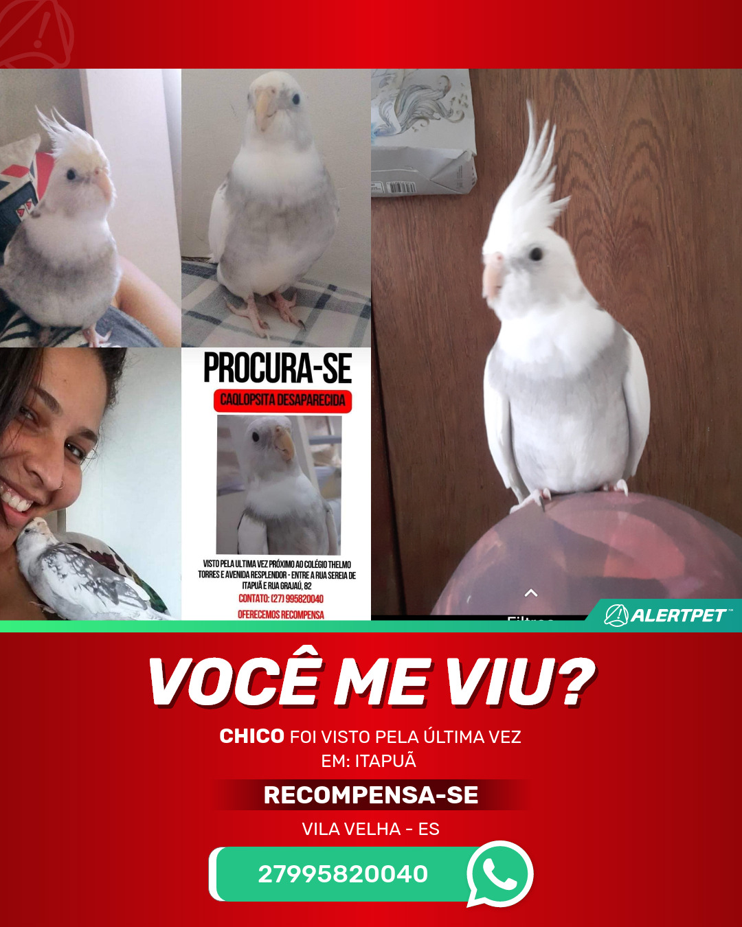 #AlertPet #Procurase #PassaroDesaparecido #VilaVelha #ProcuramosChico