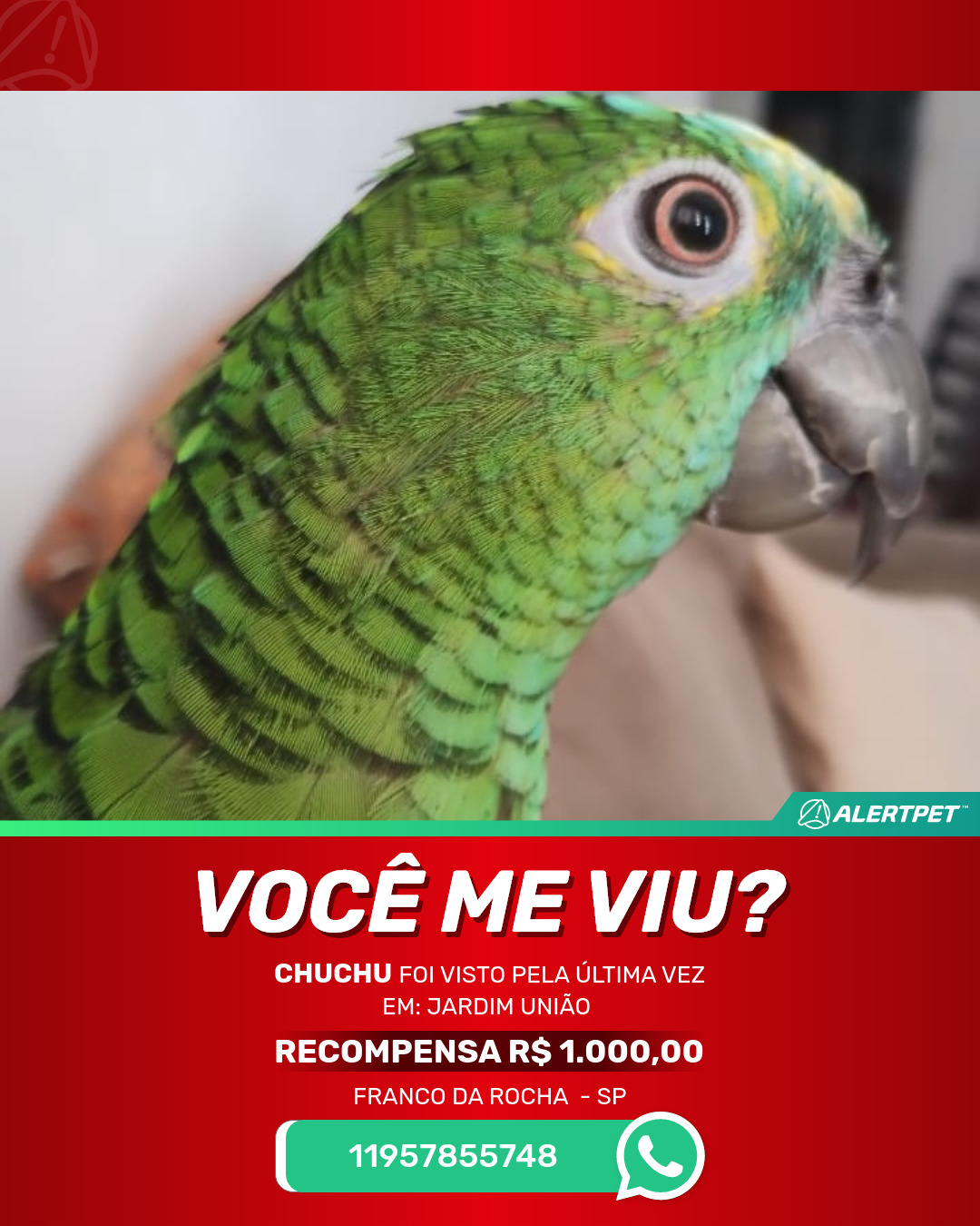 #AlertPet #Procurase #PassaroDesaparecido #FrancoDaRocha #ProcuramosChuchu