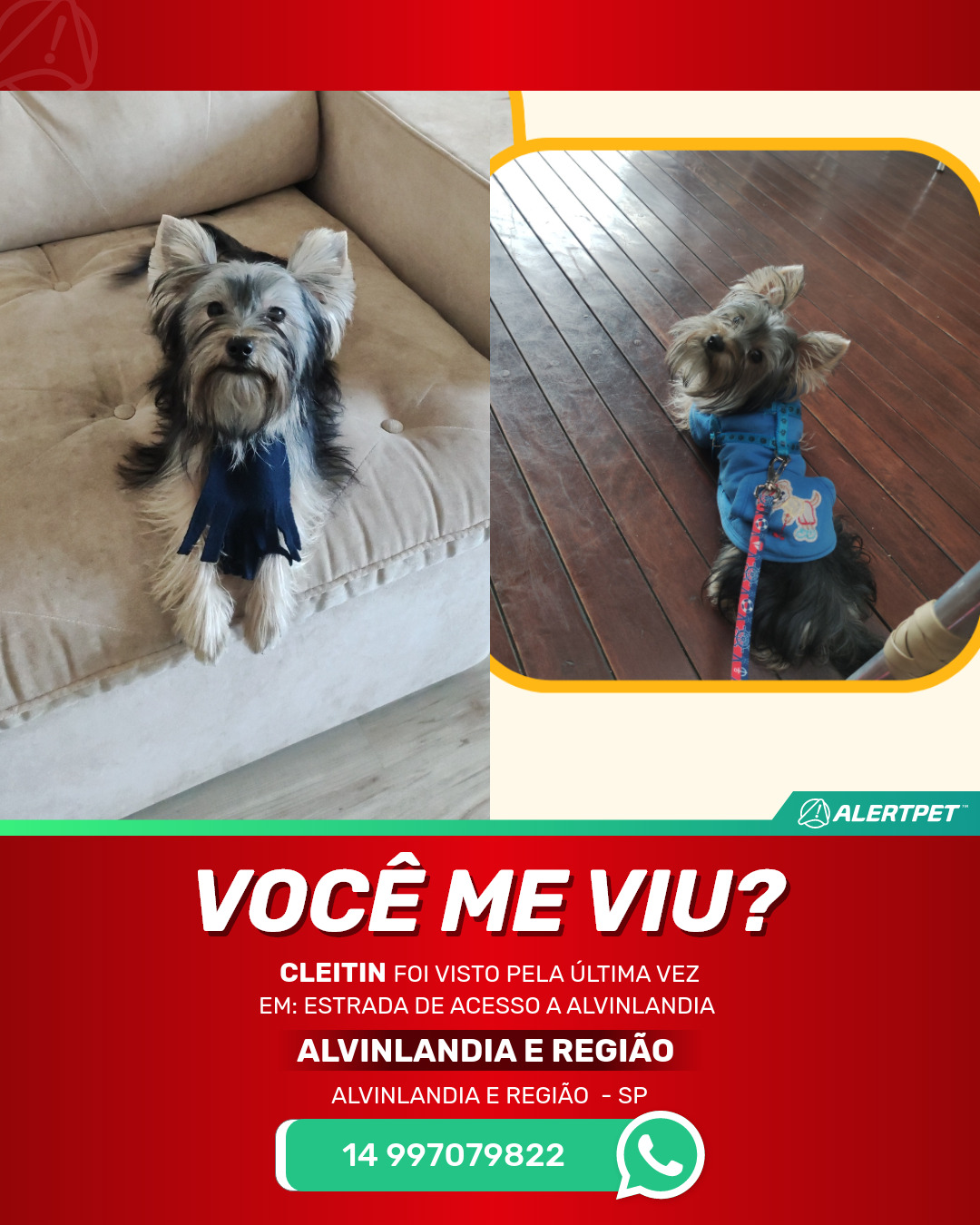 Olá, estamos procurando o Cleitin. Cachorro macho yorkshire, porte pequeno, preto e branco. Desaparecido próximo a entrada de Alvinlandia. Qualquer notícia é bem vinda!!! Pedimos ajuda de todos, estamos desesperados.