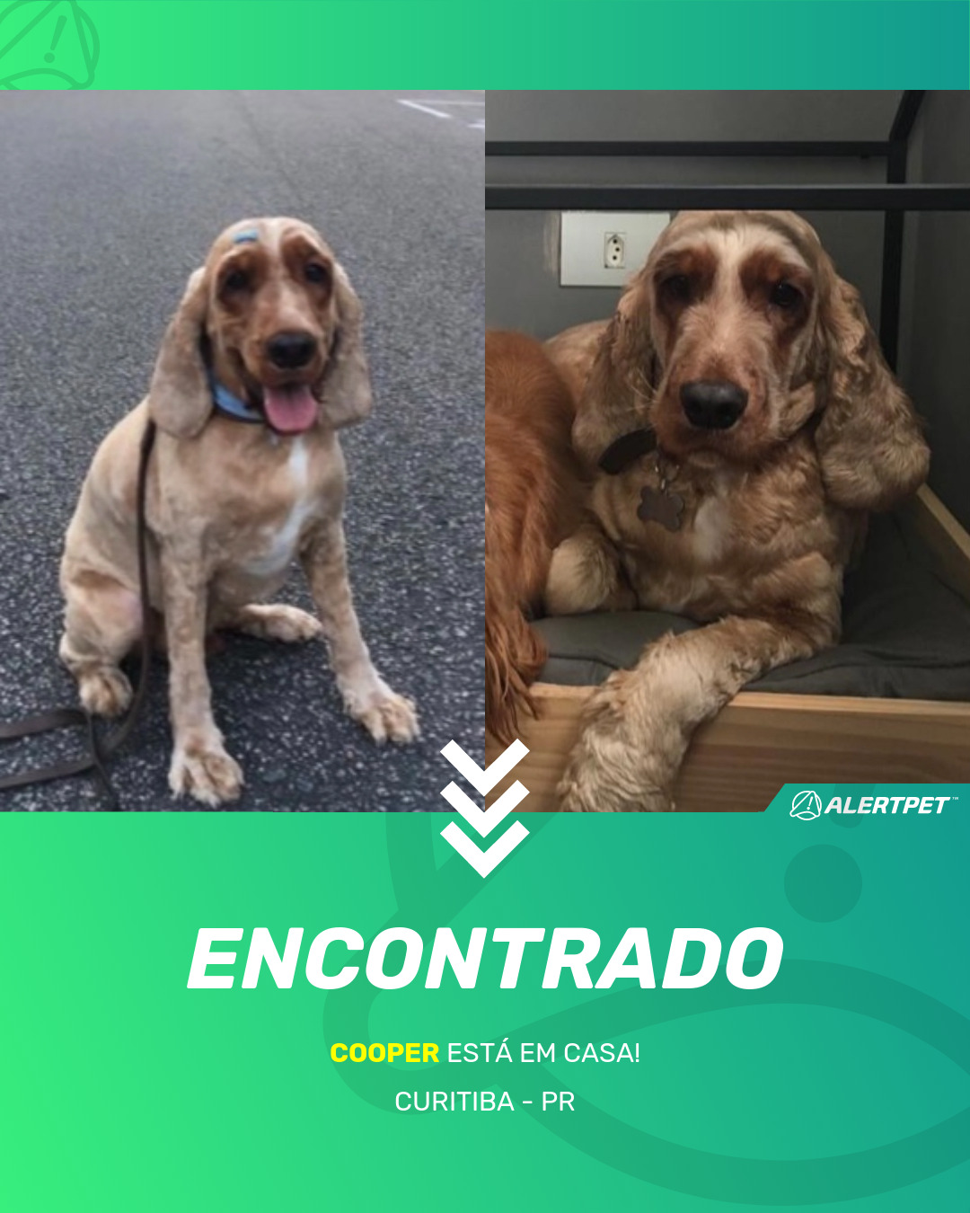 Cooper é um cocker caramelo, tosado de 2 anos e meio. É macho e castrado. Usa uma coleira de couro marrom com medalha prata em forma de ossso contendo seu nome e o telefone do dono.Saímos para passear com ele no dia 27/10 por volta das 19h30 e um homem o assustou jogando um saco de lixo nele. Ele ficou acoado e fugiu em direção à rua Coronel Macedo (centro). Corremos atrás dele mas não conseguimos alcançá-lo.No outro dia disseram ter visto ele na Rua Marcos Moro esquina com a Rua Dr. Roberto Barroso, no bairro São Francisco (cerca de 4km de onde ele fugiu)