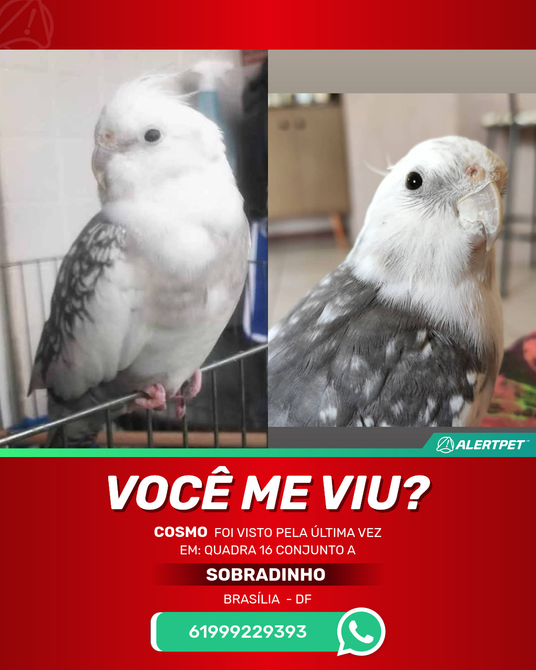 #AlertPet #Procurase #PassaroDesaparecido #Brasilia #ProcuramosCosmo