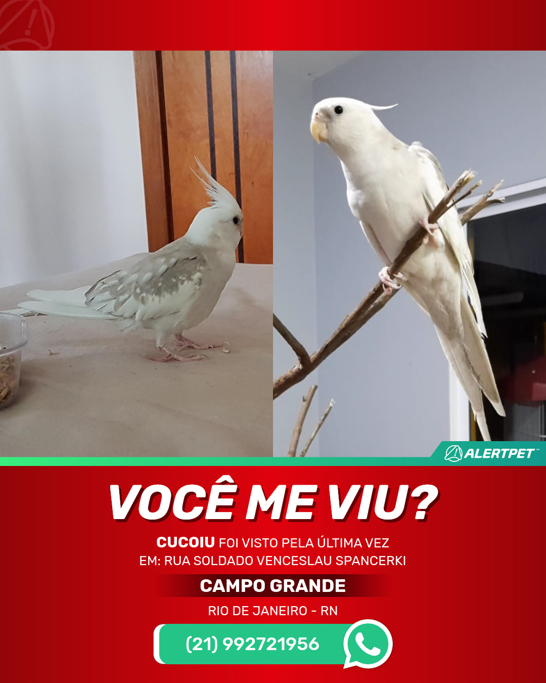 #AlertPet #Procurase #PassaroDesaparecido #RioDeJaneiro #ProcuramosCucoiu