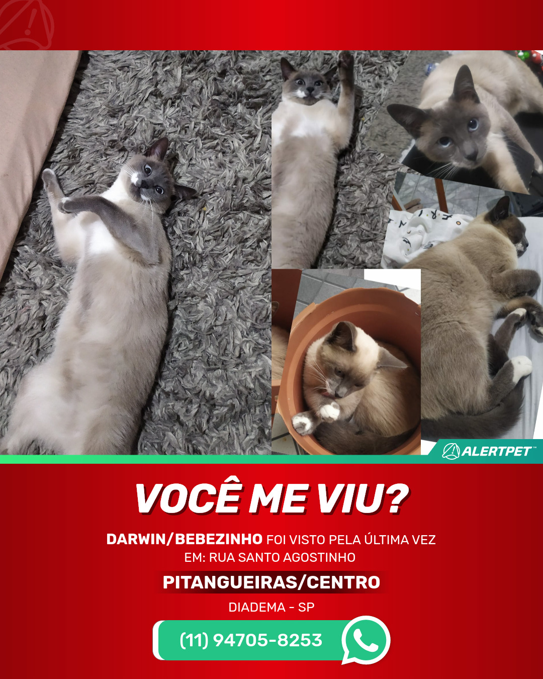 Amamos nosso Darwin se vc o encontrou ele não foi abandonado foi vítima de uma infeliz fatalidade. Estamos sofrendo muito e os dois gatinhos que são irmãozinho dele TBM sentem muita falta dele. obrigada por quem nos ajudar ou tiver pista do nosso Darwin.