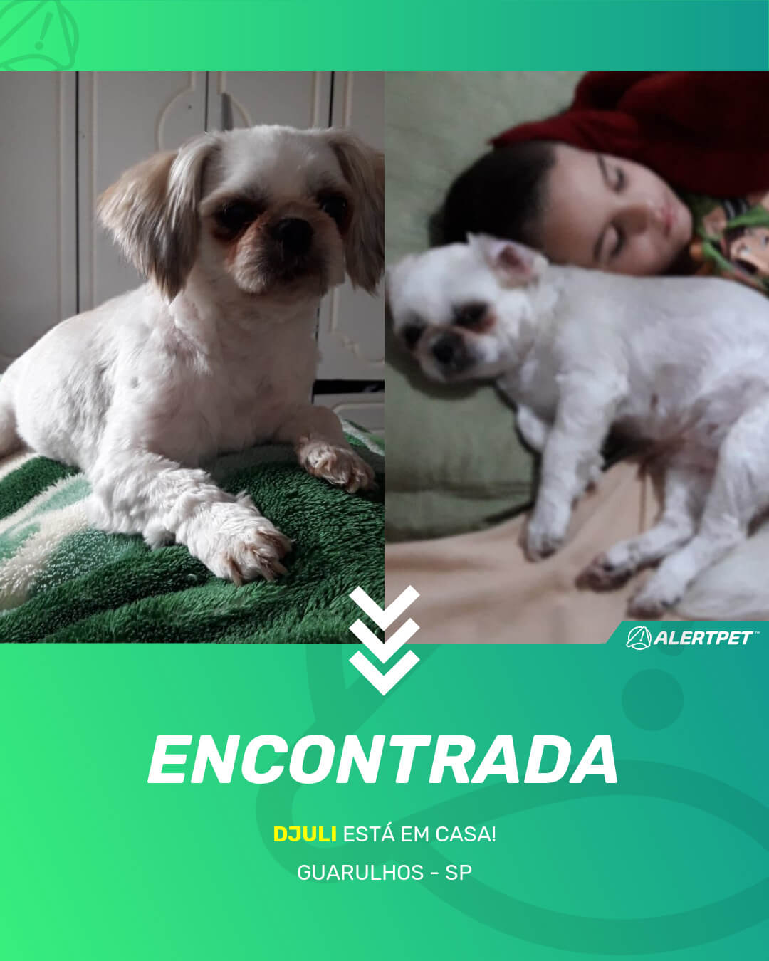 Depois de dois meses a cadelinha foi finalmente localizada graças a um anúncio da AlertPet