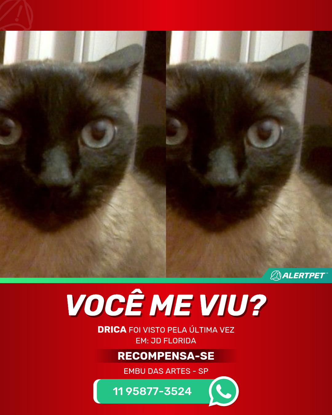 #AlertPet #Procurase #GatoDesaparecido #EmbuDasArtes #ProcuramosDrica