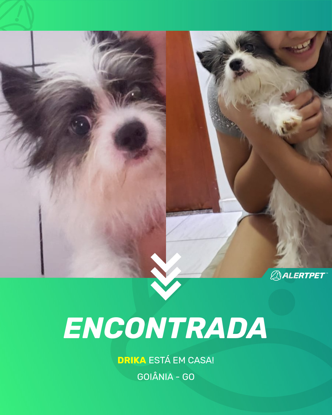 Depois de dois meses a cadelinha foi finalmente localizada graças a um anúncio da AlertPet