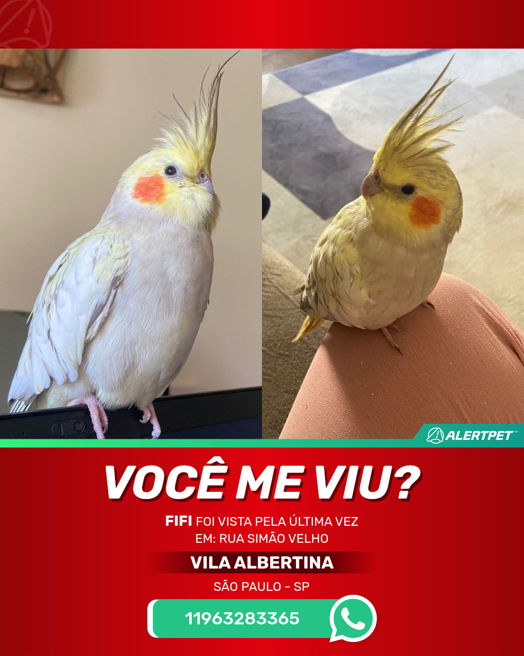 #AlertPet #Procurase #PassaroDesaparecido #SaoPaulo #ProcuramosFifi