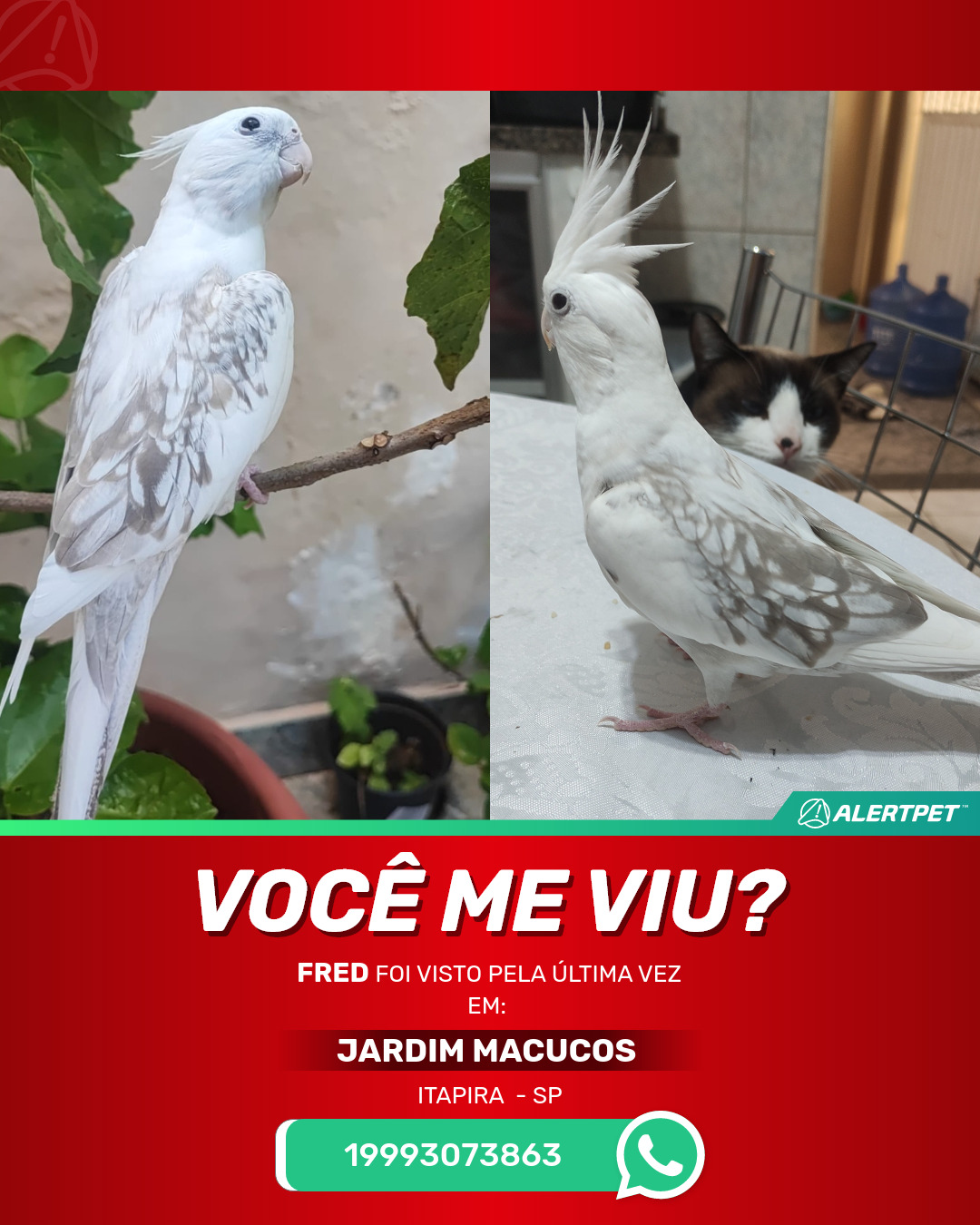 #AlertPet #Procurase #PassaroDesaparecido #Itapira #ProcuramosFred