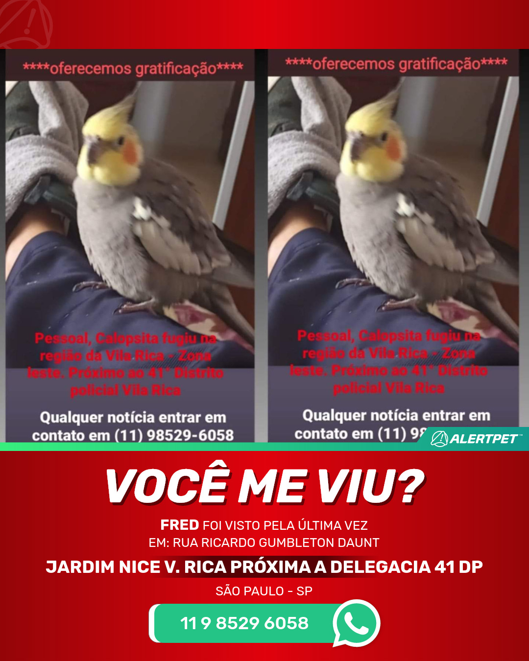 #AlertPet #Procurase #PassaroDesaparecido #SaoPaulo #ProcuramosFred