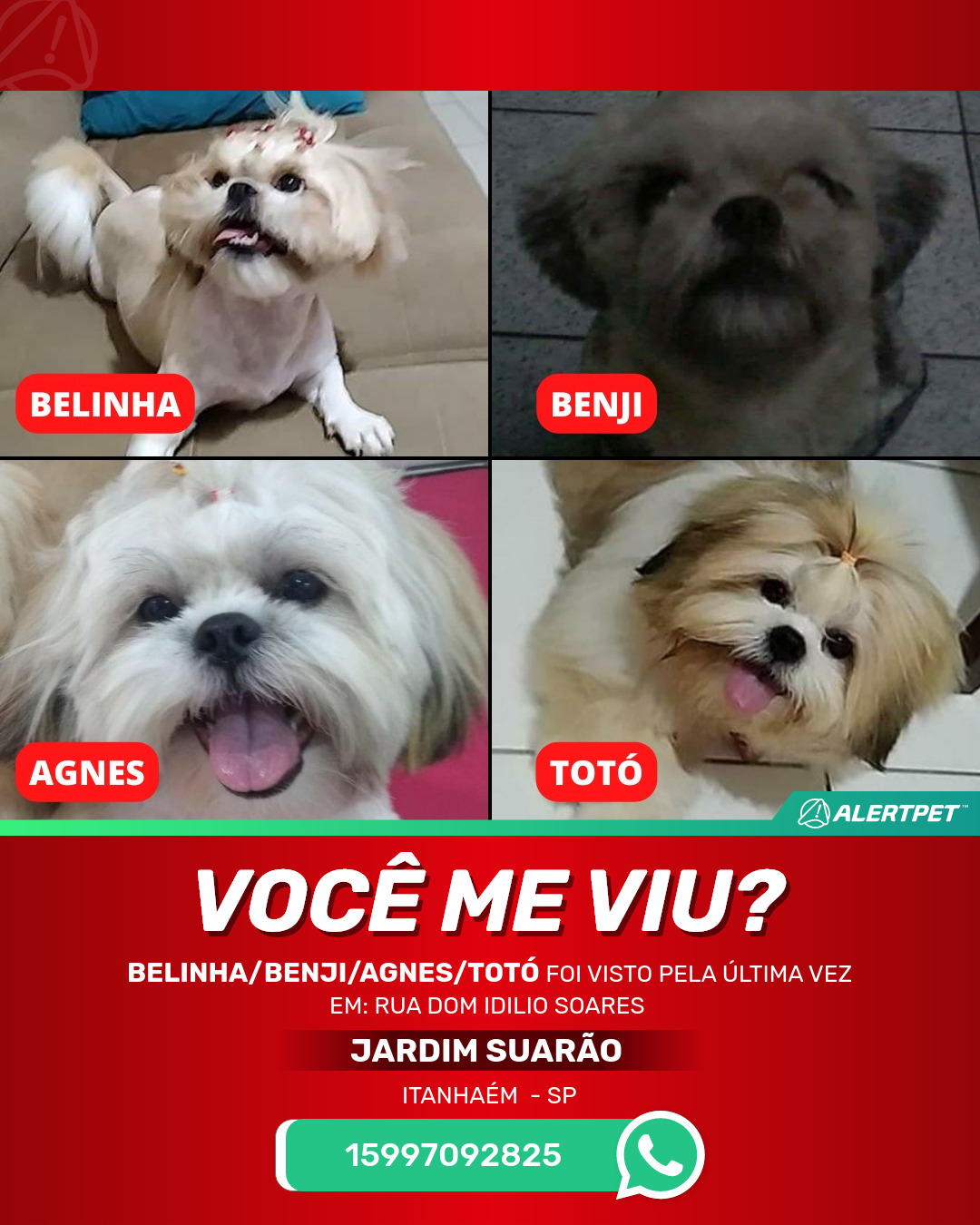 Pedimos encarecidamente que nos devolvam nossos bebês 😭! Minha mãe é viúva e os 3 cachorrinhos são o amor da vida dela ! A nossa Agnes é a alegria da nossa casa , ela é como nossa filha , minha outra cachorrinha está em depressão sem ela ! Tem adultos chorando como se fossem criança por causa dos nossos pequenos perdidos ! Quem estiver com eles nos devolva por favor ! Nos ajudem estamos desesperados ! Entrem em contato pelo whatsapp com o número 15997092825 ou com o 15997159479!