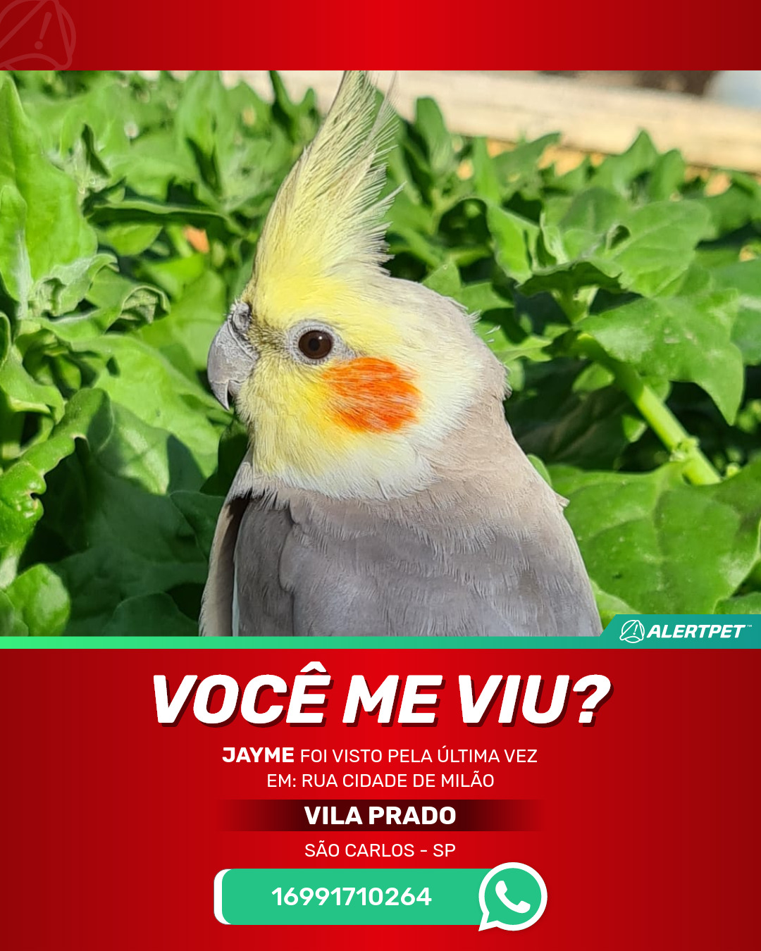 #AlertPet #Procurase #PassaroDesaparecido #SaoCarlos #ProcuramosJayme