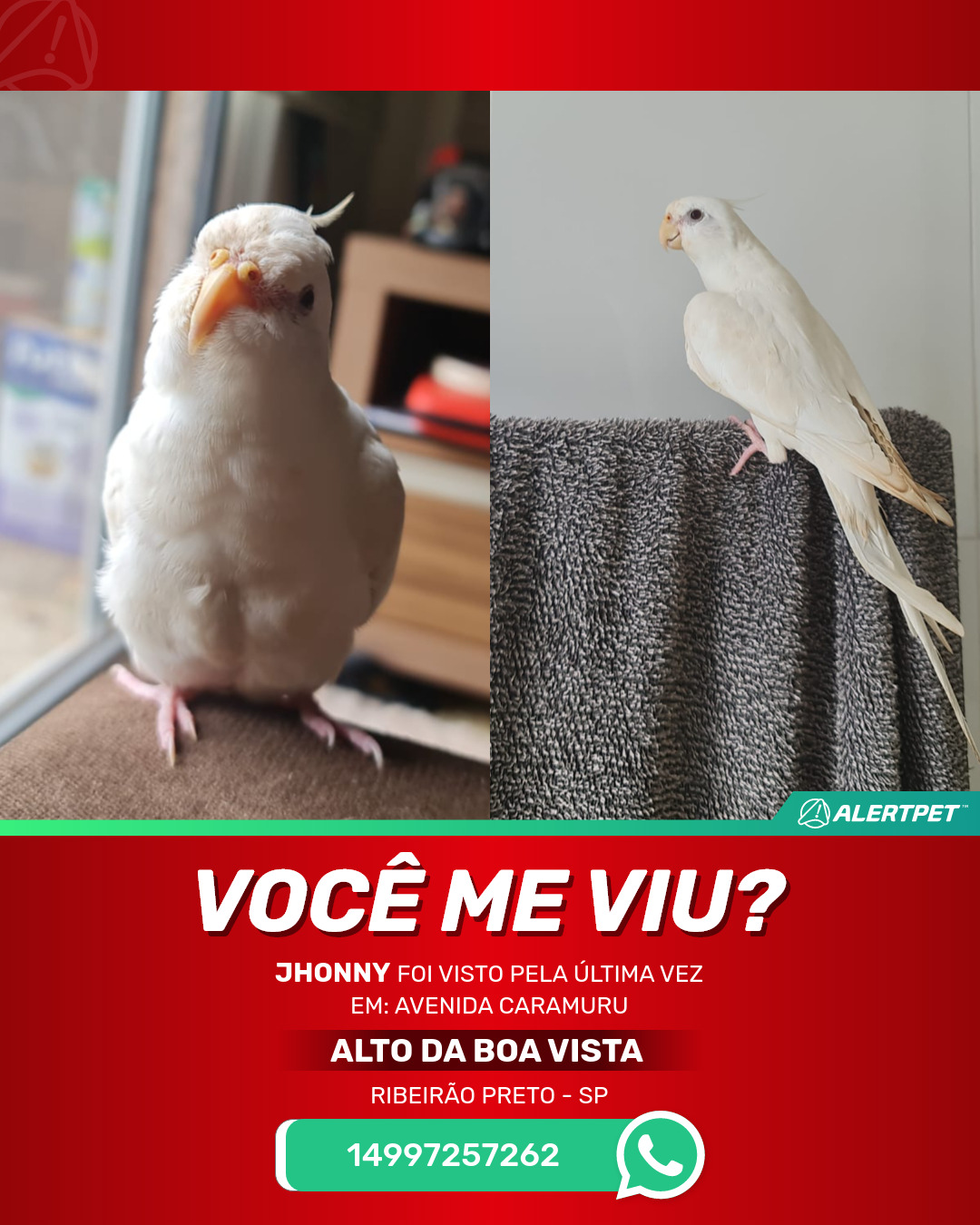 #AlertPet #Procurase #PassaroDesaparecido #RibeiraoPreto #ProcuramosJhonny