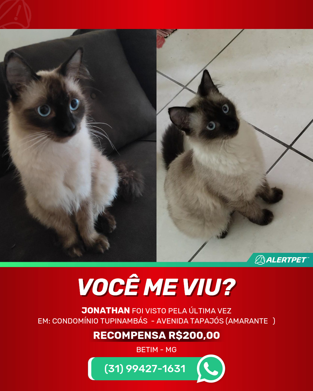Gato Perdido RECOMPENSA R$200,00 Betim - Minas Gerais | Jonathan - 1 ano