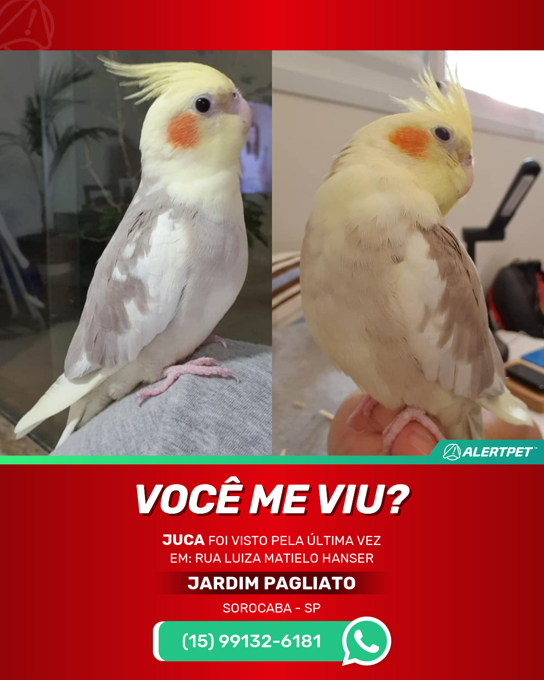 Juca é uma calopsita macho extremamente mansa, cara amarela canela, porte médio, asas quase completas (estava terminando a troca de asas), pés e bico bem rosados, olhos “grandes” e bastante apegado a família e ao irmão (outra calopsita que temos). Gosta muito de companhia, carinho e atenção, vivia praticamente o dia solto em casa. Não gosta muito de frio (temperaturas abaixo de 23 graus) ficando mais quietinho nessas condições. Estava começando a “falar”/”assobiar” diferente do canto tradicional de calopsita. Faz a brincadeira do “gila gila, gila gila, gilou” (se rodar a mão no sentido horário).