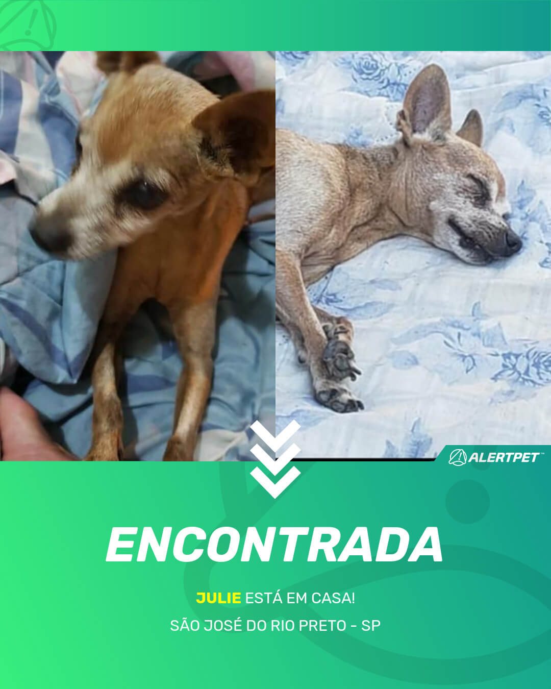 Depois de dois meses a cadelinha foi finalmente localizada graças a um anúncio da AlertPet