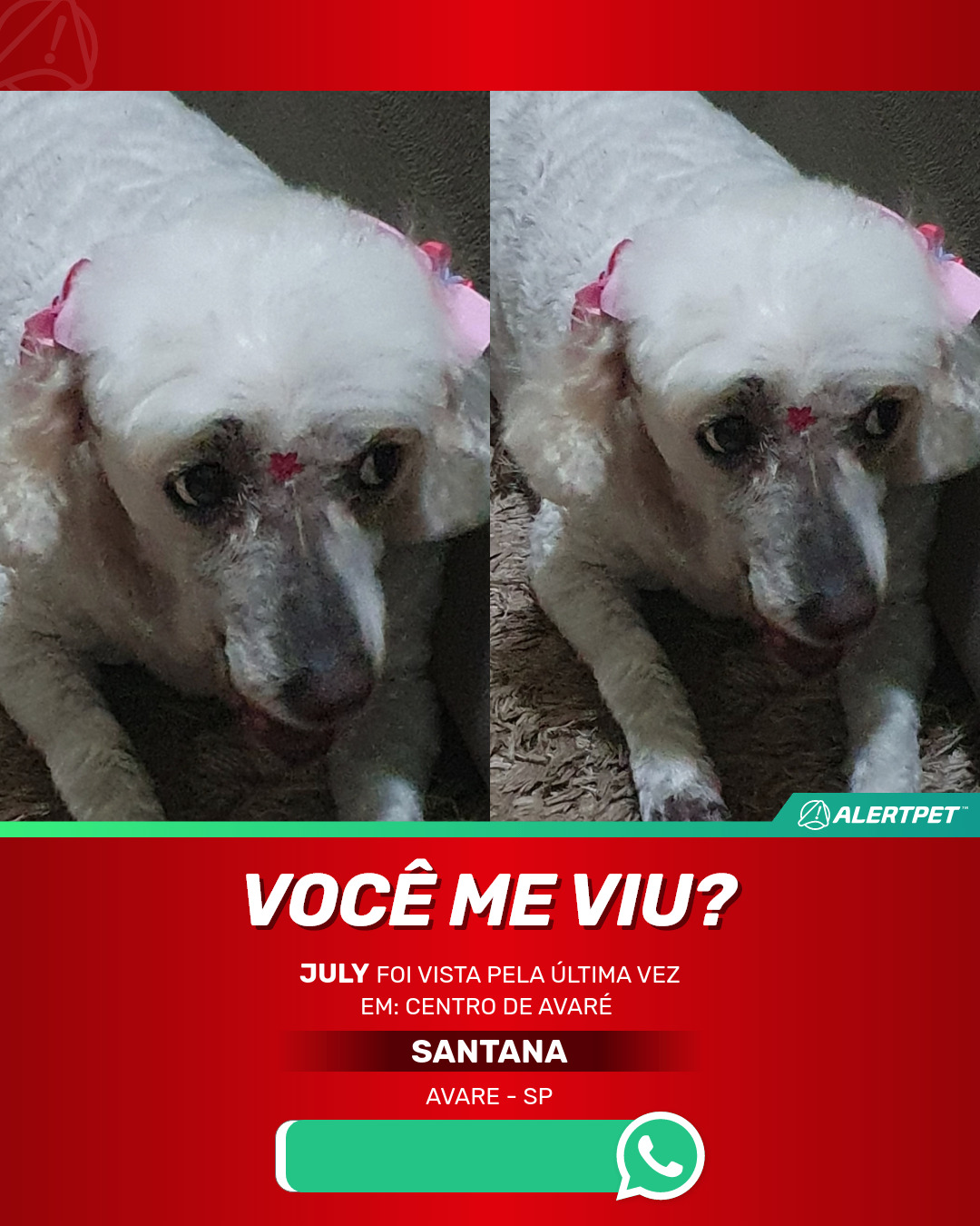 Caso tenha informações de um pet desaparecido comunicar imediatamente os tutores pelo telefone que está no anúncio.