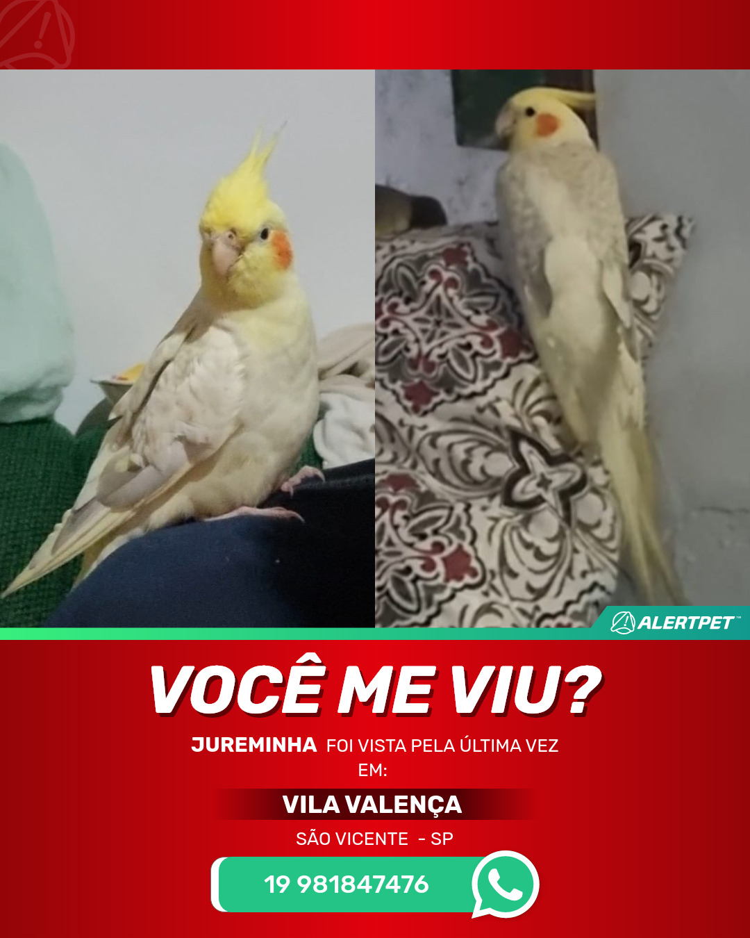 #AlertPet #Procurase #PassaroDesaparecido #SaoVicente #ProcuramosJureminha