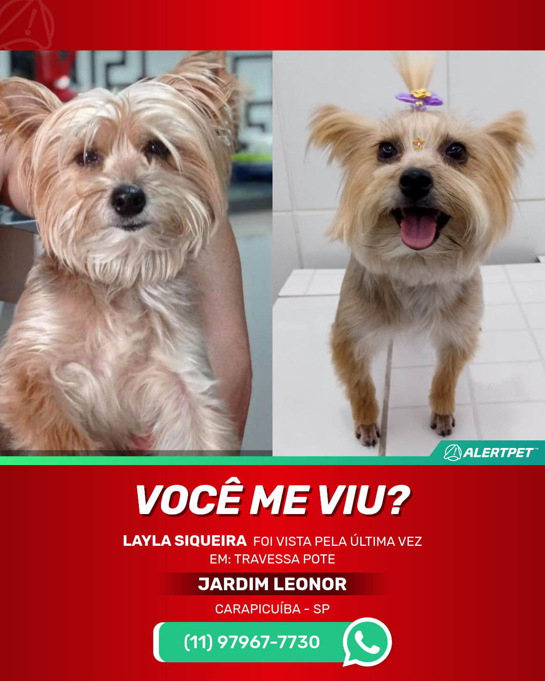 Procura-se a Layla, cachorra da raça Yorkshire, sexo fêmea, cor caramelo e cinza, castrada, corpo com a pelagem baixa, patas de botinha, cabeça e rabo peludo. Tem 4 anos e 11 meses e pesa 4.500kg.