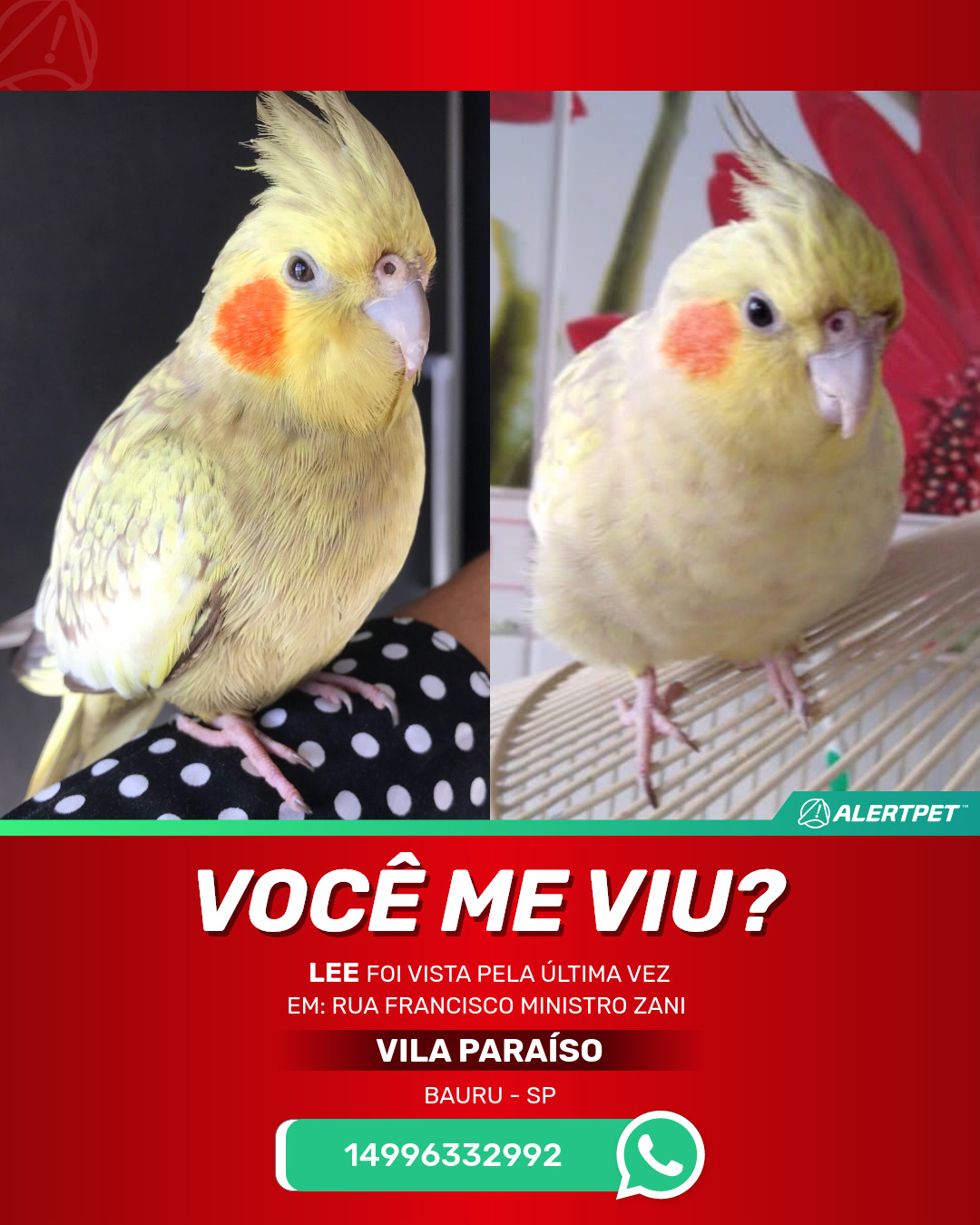 #AlertPet #Procurase #PassaroDesaparecido #Bauru #ProcuramosLee