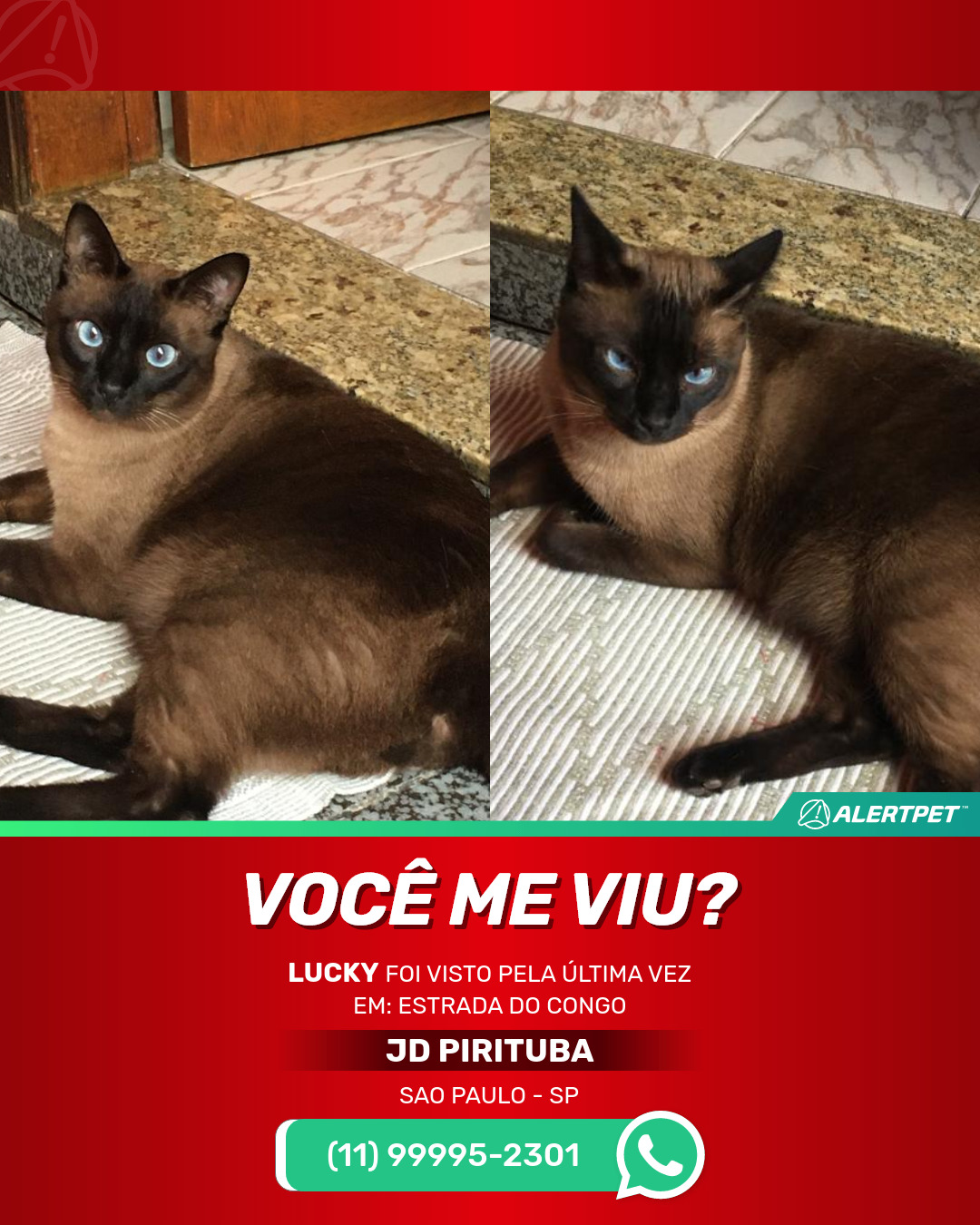 SE VC O LUCKY OU ESTIVER COM ELE, DEVOLVA, POR CARIDADE. TEMOS UM IDOSO DOENTE E OS OUTROS DOIS ANIMAIS DA CASA ESTÃO AMUADOS, TRISTES COM A AUSÊNCIA DELE. PARA NÓS NÃO É APENAS UM GATO, É UMA PESSOA DA NOSSA CASA, UM ENTE MUITO QUERIDO, ESTÁ FAZENDO MUITA FALTA, ESTAMOS TODOS MUITO TRISTES. GRATIDÃO IMENSA.