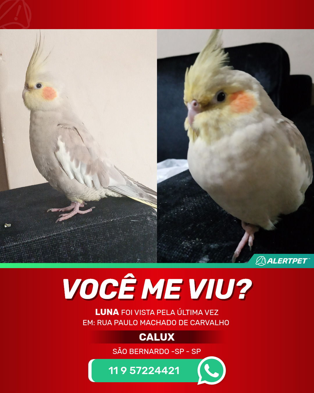 #AlertPet #Procurase #PassaroDesaparecido #SaoBernardo-sp #ProcuramosLuna