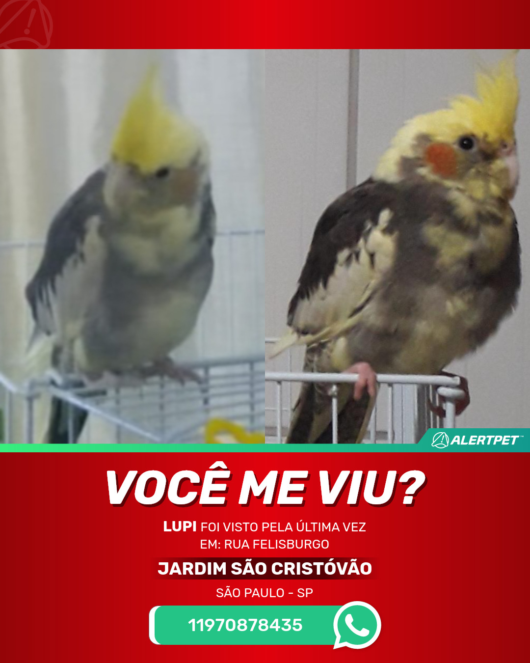 #AlertPet #Procurase #PassaroDesaparecido #SaoPaulo #ProcuramosLupi