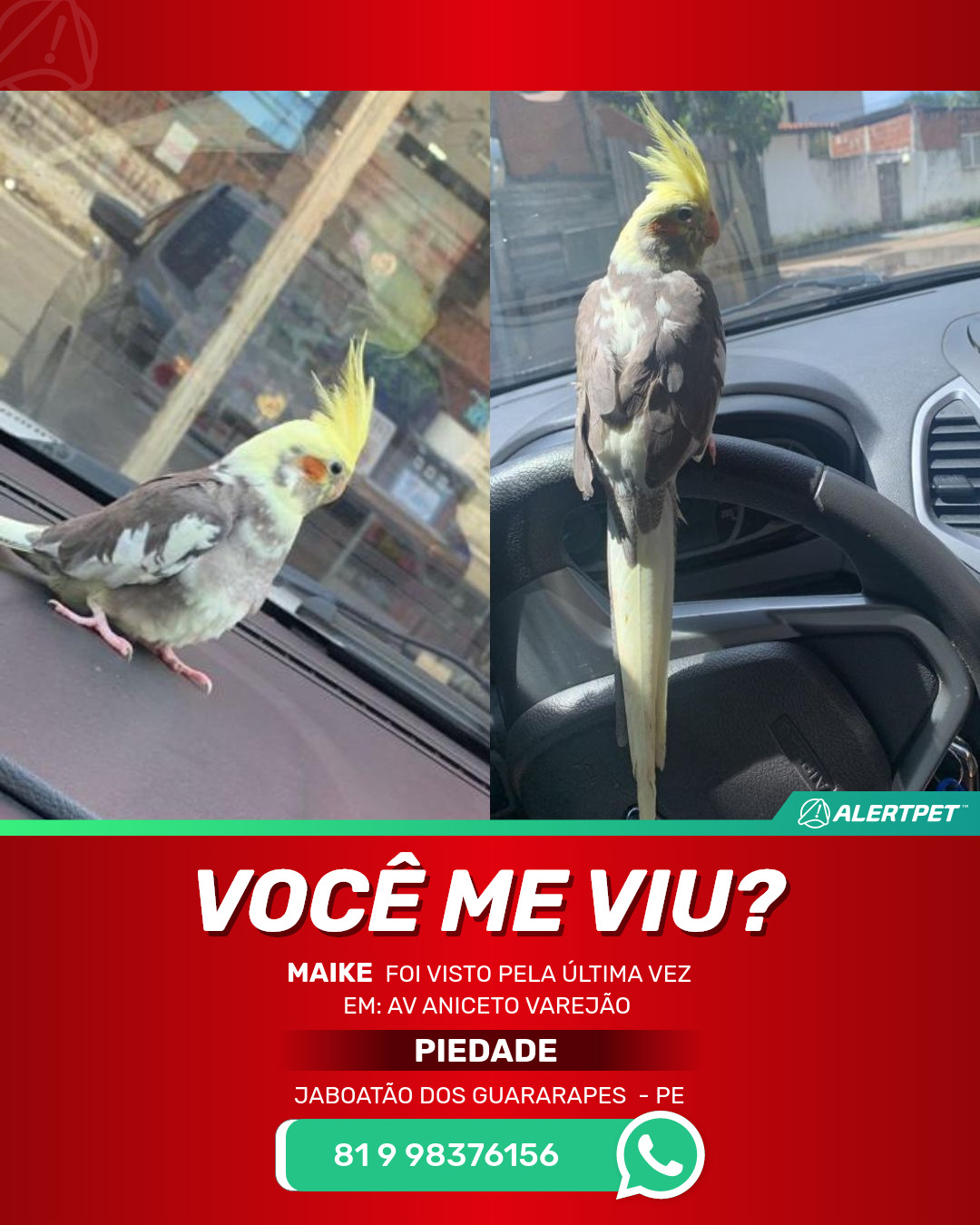 #AlertPet #Procurase #PassaroDesaparecido #JaboataoDosGuararapes #ProcuramosMaike