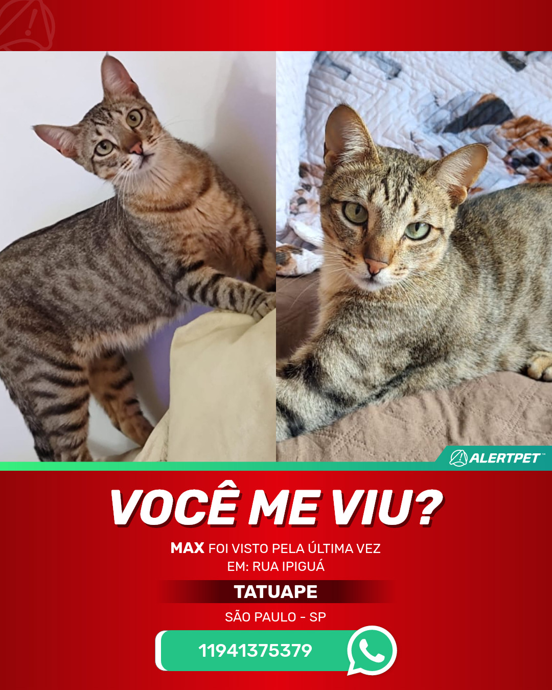 Meu gatinho Max, visto pela última vez dia 11/10 as 23h, tem pelo tigrado, é um gato comprido e forte, pesa 5kg. É um Gato comunicativo, mia bem alto quando se sente preso, é arisco…ele tem um chip identificador que foi aplicado na pele quando castrado na clínica credenciada á prefeitura. Quem o encontrar poderá levá-lo a uma clínica veterinária pra fazer a leitura dos meus dados.