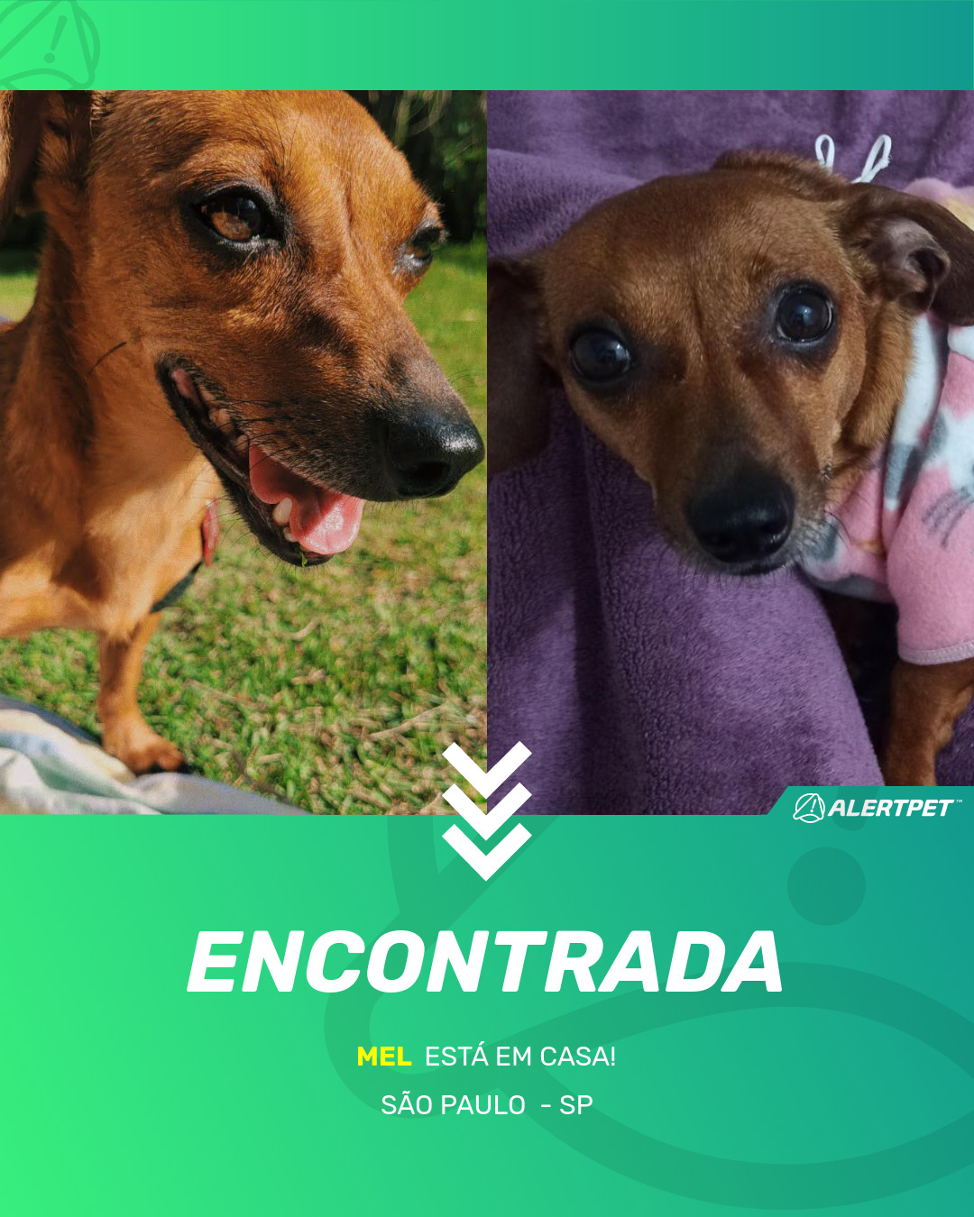 Depois de dois meses a cadelinha foi finalmente localizada graças a um anúncio da AlertPet