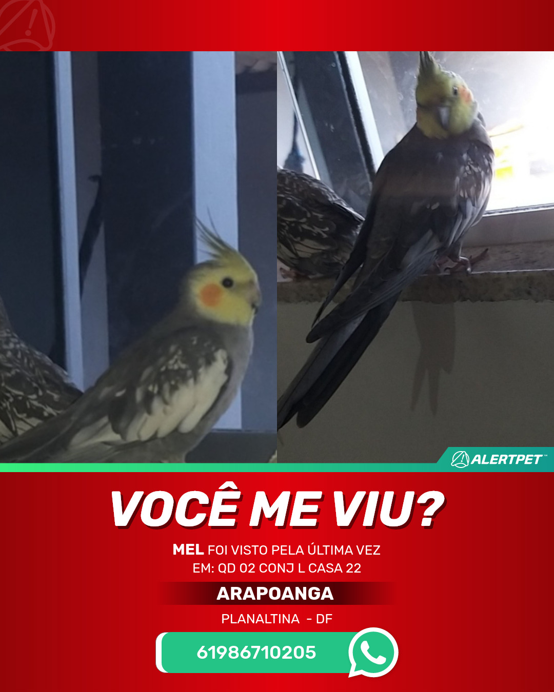 #AlertPet #Procurase #PassaroDesaparecido #Planaltina #ProcuramosMel