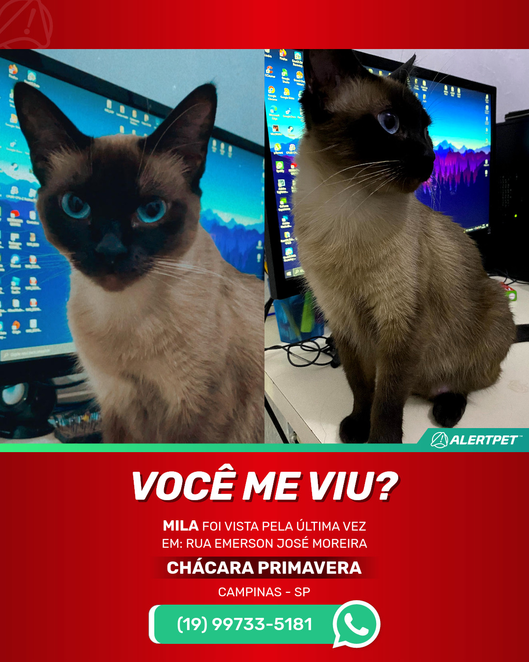 Mila é um gata, adulta de médio porte, pesa em média de 4 kg, predominância de cores marrons, famoso sialata, castrada, dócil e assustada (não costuma ir com pessoas desconhecidas), e tem 2 anos de idade, visto pela última vez por volta das duas horas da manha do dia 05/02/22