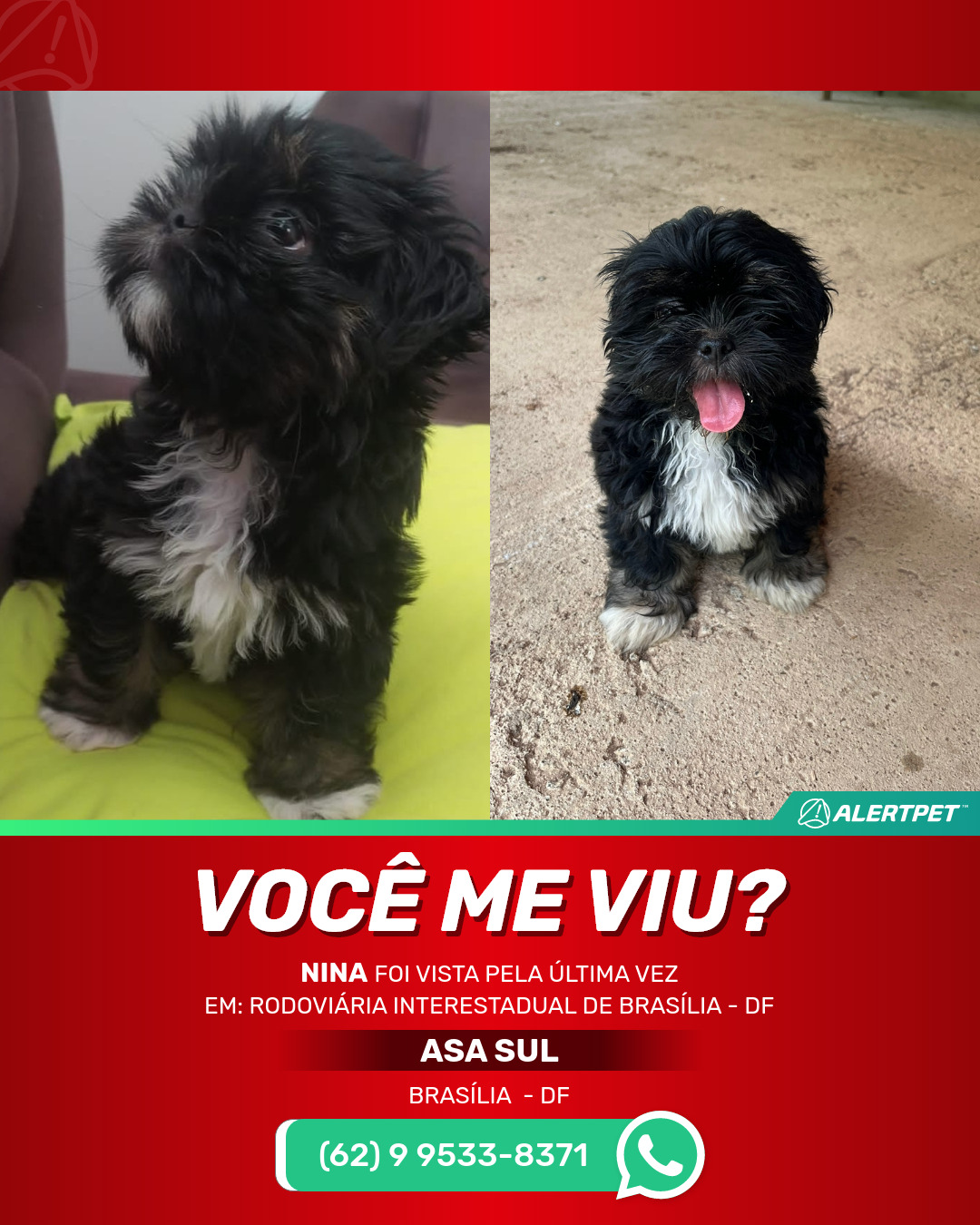 Perdi minha cachorrinha no dia 03/01, dentro da Rodoviária Interestadual de Brasília, por volta das 17:00h, raça Shitzu, cor preta, atende pelo nome de Nina,soubemos que ela foi acolhida por 2 mulheres, peço que por favor me ajudem a levar essa informação até elas, pois acredito que elas ainda não sabem da nossa busca. Por favor estou desesperada, pago recompensa!! (62) 9 9533-8371-Danielly