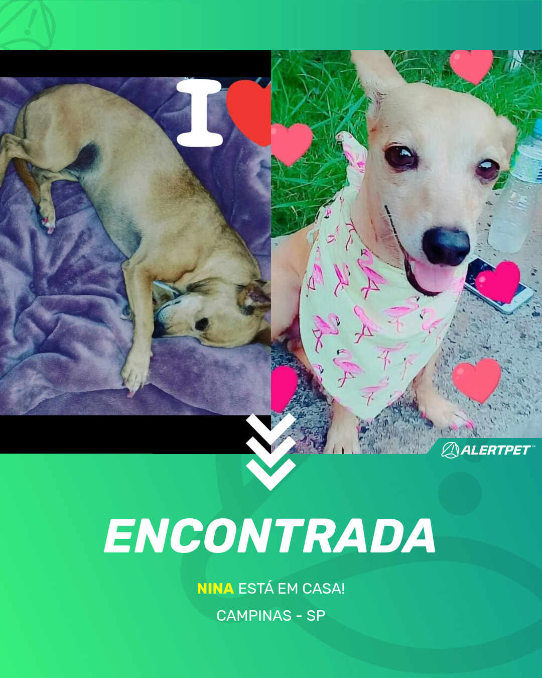 Depois de dois meses a cadelinha foi finalmente localizada graças a um anúncio da AlertPet
