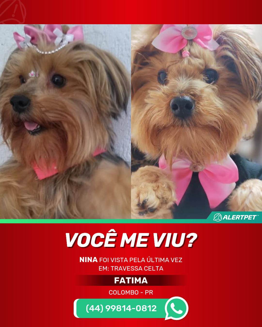 Por gentileza, qualquer informação sobre a Nina entre em contato, ela era o xodó da nossa família. Estamos muito tristes e em busca de qualquer notícia! Agradecemos de coração.